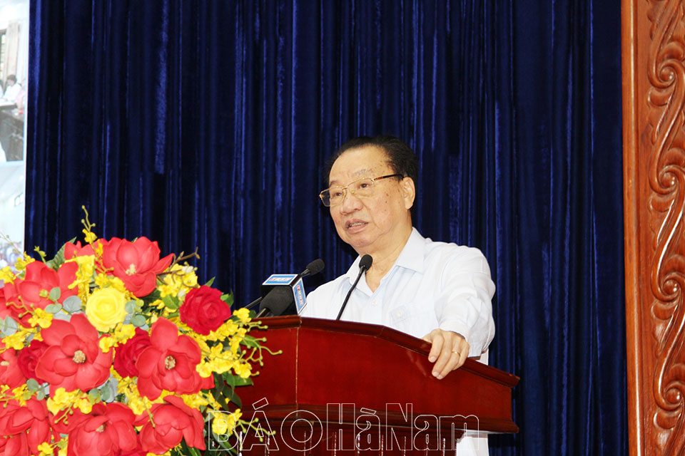 Đồng chí tập trung phân tích làm rõ ý nghĩa, giá trị nội dung bài viết của Tổng Bí thư về truyền thống lịch sử vẻ vang của Đảng; sứ mệnh lãnh đạo cách mạng Việt Nam của Đảng gắn với vai trò to lớn của Chủ tịch Hồ Chí Minh - Người đã tìm ra con đường cứu nước đúng đắn, tổ chức, giáo dục, rèn luyện Đảng ta làm nên những kỳ tích vĩ đại trong 94 năm qua; những nội dung giá trị truyền thống cách mạng cần phát huy; nhiệm vụ trọng tâm trong thời gian tới đối với nước nhà nói chung, tỉnh Hà Nam nói riêng từ nay đến hết nhiệm kỳ Đại hội XIII của Đảng. Trong đó, tập trung thực hiện thật tốt những nhiệm vụ về phát triển kinh tế; văn hóa, xã hội; quốc phòng, an ninh, đối ngoại; xây dựng Đảng và hệ thống chính trị; chuẩn bị cho đại hội đảng bộ các cấp, tiến tới Đại hội đại biểu toàn quốc lần thứ XIV của Đảng, phấn đấu đến năm 2030, kỷ niệm 100 năm thành lập Đảng: Nước ta sẽ là nước đang phát triển, có công nghiệp hiện đại, thu nhập trung bình cao.