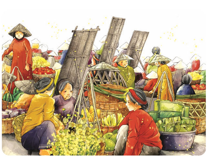 Tuổi ấu thơ, tôi thường có những lần hì hụi đẩy xe cùng bố lội màn đêm đi về những phiên chợ Tết sớm. Bố thường dặn tôi, bán hàng thì đúng giá, không nói thách. Gặp các cụ già thì phải lấy rẻ hơn. Lớn lên tôi tự mình thồ những sản vật của vườn tược ruộng đồng một nắng hai sương với tâm trạng hồ hởi. Ngày đó, người dân thường lấy độ cao của những chiếc xe thồ hàng làm tín hiệu cho ngày Tết. Xe rau chất càng cao thì có nghĩa rau tiêu thụ được nhiều, đắt hàng, niềm vui in trên mặt người đi chợ, thắp nơi tim của những chiếc đèn bão, xuân đó sẽ vui hơn, ấm hơn. Bán được rau, nhà nào cũng sẽ rủng rỉnh sắm quần áo mới cho con cái, mua bánh kẹo, mứt Tết, chuẩn bị gạo thịt gói bánh chưng…