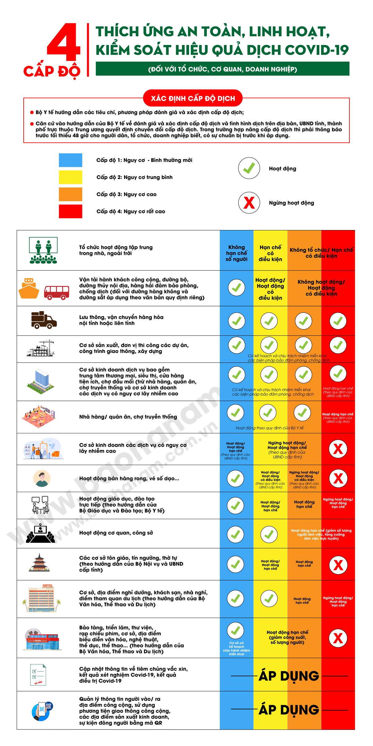 Những lĩnh vực được hoạt động ở cả bốn cấp độ gồm: Lưu thông, vận chuyển hàng hóa nội tỉnh, liên tỉnh; cơ sở sản xuất, dự án, công trình giao thông, xây dựng. Trung tâm thương mại, siêu thị, cửa hàng tiện ích, chợ đầu mối; nhà hàng, quán ăn, chợ truyền thống được mở cửa ở cả bốn cấp độ, nhưng hạn chế hơn ở cấp độ 4. Quy định trên được áp dụng thống nhất toàn quốc. Các địa phương có thể bổ sung thêm biện pháp, nhưng không trái với quy định của Trung ương; không gây ắc tắc lưu thông hàng hóa, sản xuất kinh doanh và đi lại, sinh hoạt của người dân.