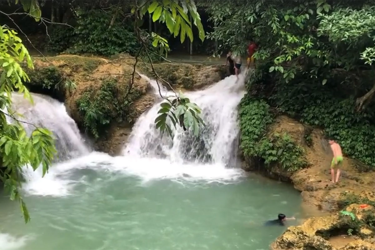 Trẻ em địa phương tắm trong hồ bơi tự nhiên ở thác.