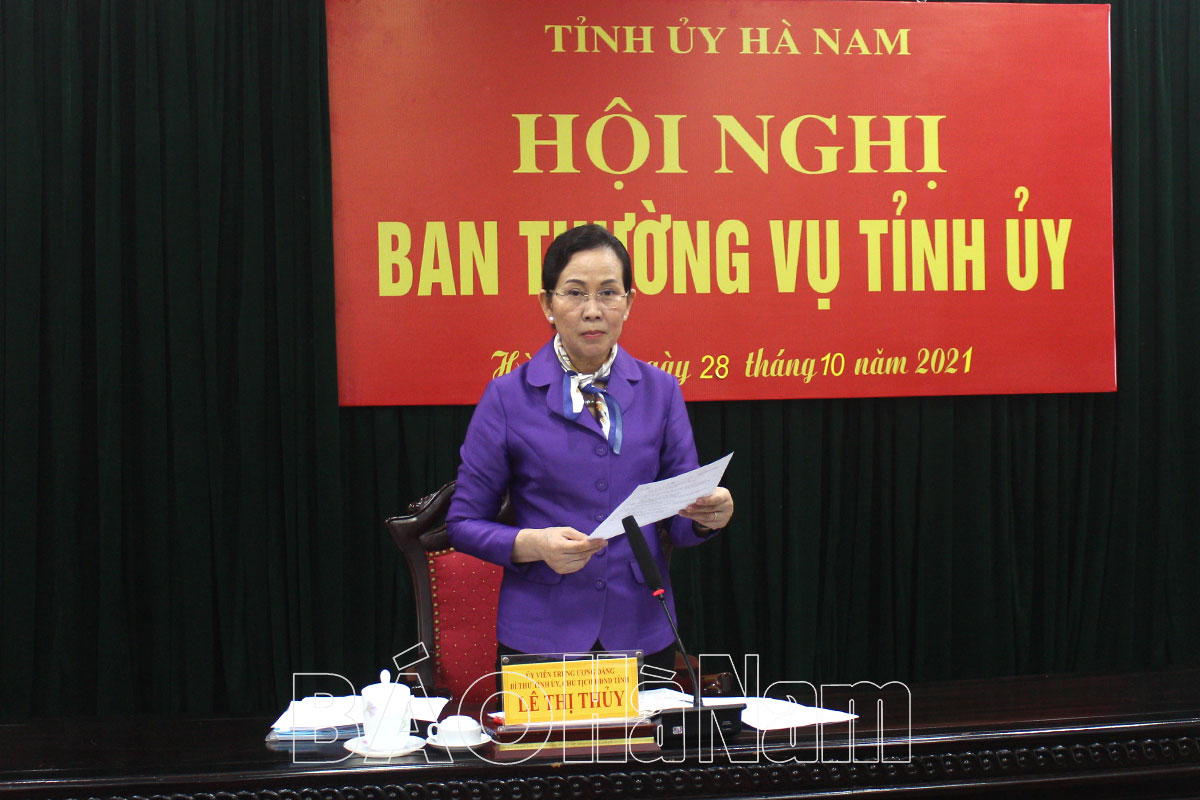 Sáng 28/10, Ban Thường vụ (BTV) Tỉnh ủy Hà Nam tổ chức hội nghị cho ý kiến, chủ trương các nội dung về phát triển kinh tế - xã hội, công tác tổ chức bộ máy, cán bộ; tổ chức Đại hội Đại biểu phụ nữ tỉnh lần thứ XVII, nhiệm kỳ 2021-2026 và các nội dung thuộc thẩm quyền. Đồng chí Lê Thị Thủy, Ủy viên Trung ương Đảng, Bí thư Tỉnh ủy, Chủ tịch HĐND tỉnh chủ trì hội nghị.