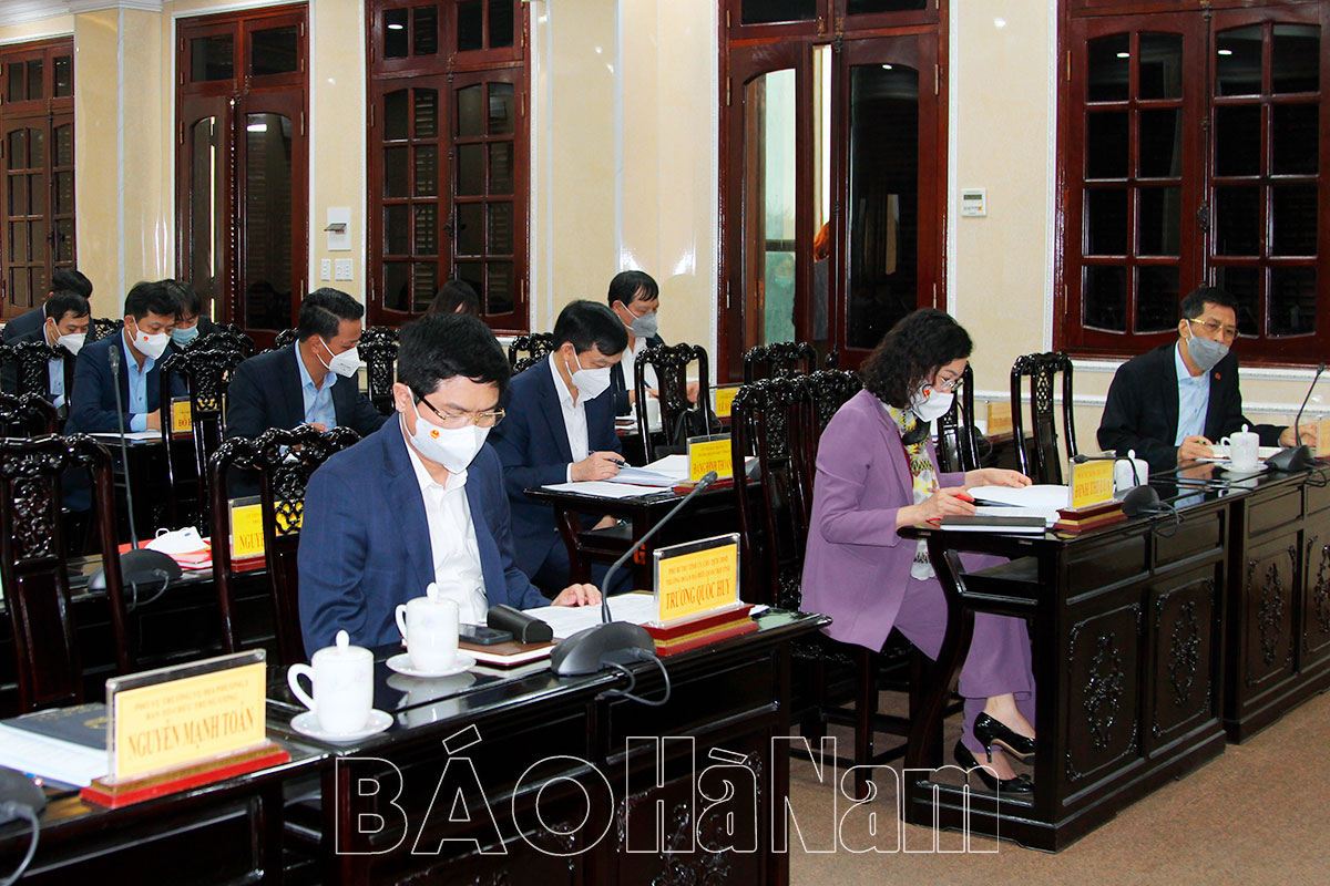 Phê duyệt Đồ án Quy hoạch chi tiết tỷ lệ 1/500 Khu nhà ở tại xã Thanh Phong, huyện Thanh Liêm. Chủ trương đầu tư Dự án xây dựng cở sở giáo dục và đào tạo tại Khu đại học Nam Cao. Chủ trương đầu tư Dự án đầu tư xây dựng Khu nhà ở tại thị trấn Tân Thanh và xã Thanh Phong, huyện Thanh Liêm. Chủ trương đầu tư Dự án đầu tư Khu đô thị mới tại thị trấn Tân Thanh, huyện Thanh Liêm. Thực hiện Dự án kè chống sạt lở, ứng phó biến đổi khí hậu, bảo vệ dân sinh và sản xuất nông nghiệp tỉnh Hà Nam sử dụng vốn vay ODA của cơ quan phát triển Pháp. Bổ sung kinh phí cho BHXH tỉnh để mua thẻ BHYT, BHXH tự nguyện cho các đối tượng được ngân sách nhà nước đảm bảo hỗ trợ. Phát biểu kết luận hội nghị: Đồng chí Lê Thị Thủy, Ủy viên Trung ương Đảng, Bí thư Tỉnh, Chủ tịch HĐND tỉnh đề nghị: Ban Cán sự Đảng UBND tỉnh, các địa phương, ban, ngành liên quan cần bám sát sự chỉ đạo của Trung ương, của tỉnh, nắm chắc tình hình cụ thể của địa phương để triển khai thực hiện các dự án đảm bảo đúng quy định, trình tự, nguyên tắc.