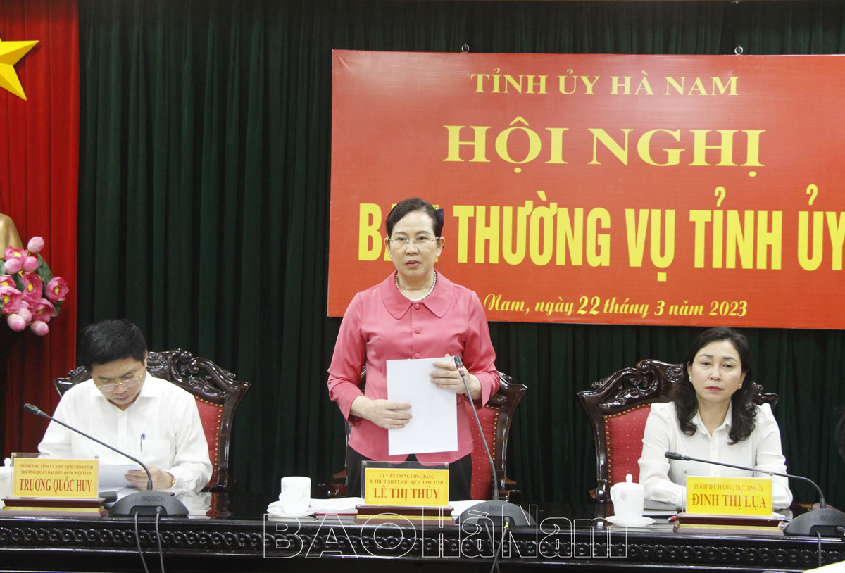 Phát biểu kết luận hội nghị, đồng chí Lê Thị Thủy, Ủy viên Trung ương Đảng, Bí thư Tỉnh ủy, Chủ tịch HĐND tỉnh yêu cầu BCH, BTV Huyện ủy Bình Lục tiếp tục thực hiện nghiêm túc các văn bản chỉ đạo của Trung ương, của tỉnh về công tác xây dựng Đảng, xây dựng hệ thống chính trị; lãnh đạo nhiệm vụ phát triển KT-XH. Trong đó, đối với công tác Đảng, huyện cần tăng cường thực hiện quy chế làm việc, thực hiện tốt việc phê và tự phê bình, thực hiện nguyên tắc tập trung dân chủ trong toàn Đảng bộ; đẩy mạnh và nâng cao chất lượng hoạt động kiểm tra, giám sát. Đồng thời, làm tốt công tác dân vận, nhất là dân vận chính quyền; thực hiện phòng chống tham nhũng, lãng phí; giải quyết đơn thư; tăng cường quản lý đất đai và các chương trình, dự án thuộc thẩm quyền; đảm bảo an ninh tôn giáo, an ninh nông thôn.