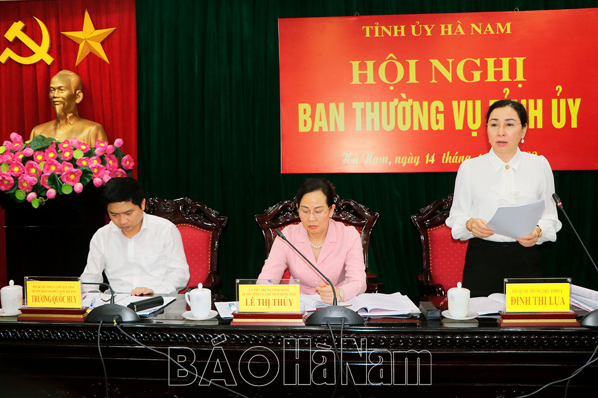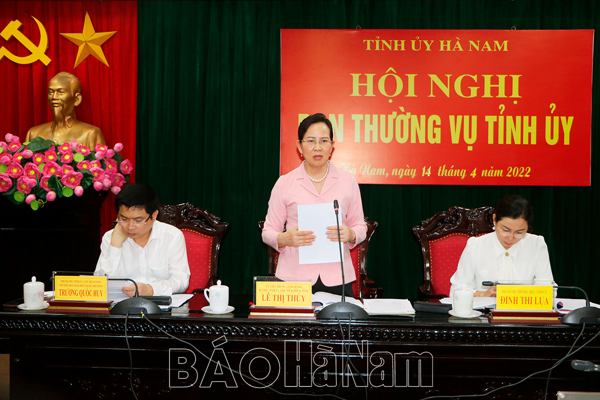 Phát biểu kết luận buổi làm việc, đồng chí Lê Thị Thủy, Ủy viên Trung ương Đảng, Bí thư Tỉnh ủy, Chủ tịch HĐND tỉnh ghi nhận, đánh giá cao nỗ lực và trách nhiệm của BTV huyện ủy Lý Nhân trong lãnh đạo, chỉ đạo thực hiện Nghị quyết ĐH Đảng bộ các cấp từ đầu nhiệm kỳ đến nay. BTV Tỉnh ủy cơ bản thống nhất với phương hướng, mục tiêu, nhiệm vụ, giải pháp đã nêu của Lý Nhân.