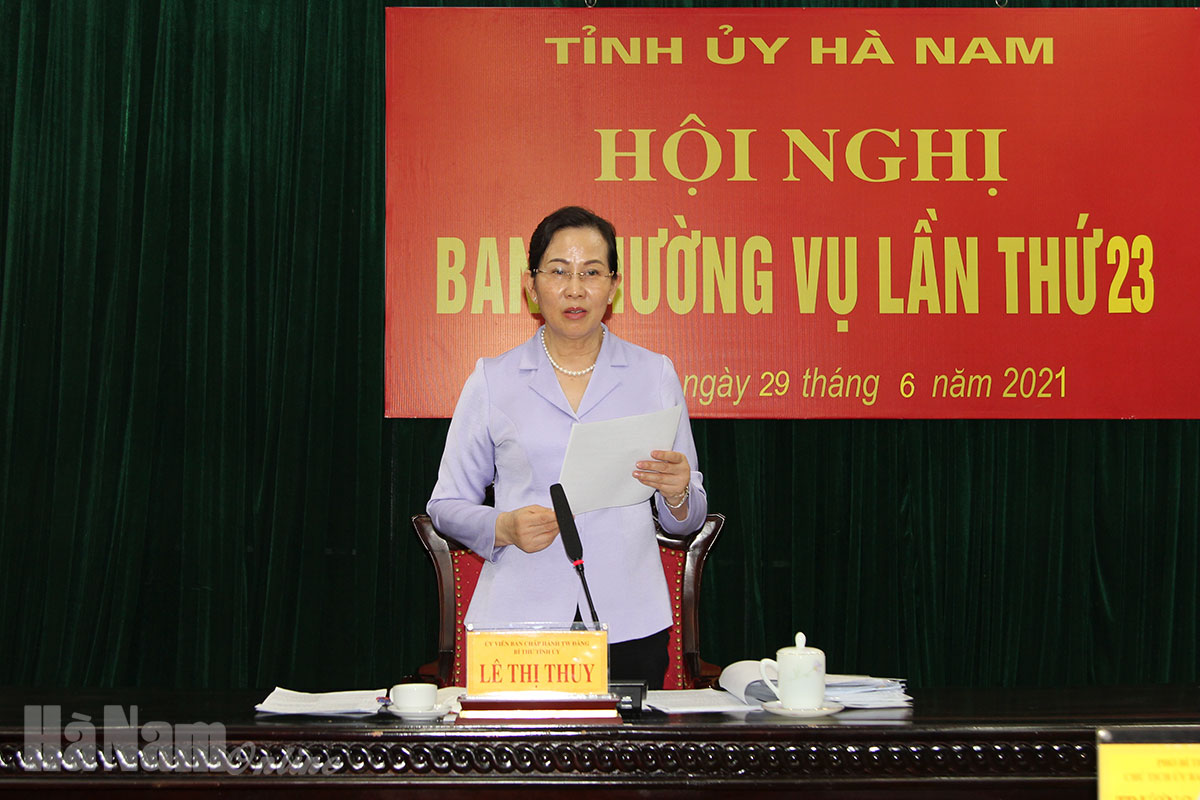 Thống nhất, bổ sung về các vấn đề do Đảng đoàn HĐND tỉnh, Ban Cán sự Đảng UBND tỉnh trình bày và các nội dung trong dự thảo báo cáo kết quả công tác 6 tháng đầu năm, nhiệm vụ trọng tâm công tác 6 tháng cuối năm của Tỉnh ủy, đồng chí Bí thư Tỉnh ủy Lê Thị Thủy nhấn mạnh: 6 tháng đầu năm 2021 trong điều kiện nhiều khó khăn, thách thức, nhất là ảnh hưởng của đại dịch Covid-19 Ban Chấp hành (BCH), BTV Tỉnh ủy đã tập trung lãnh đạo, chỉ đạo triển khai các nhiệm vụ chính trị của tỉnh đạt được nhiều kết quả quan trọng. Đặc biệt BCH, BTV Tỉnh ủy đã tập trung chỉ đạo quyết liệt, hiệu quả công tác phòng, chống dịch bệnh, nhất là dịch bệnh Covid-19 gắn với nhiệm vụ phát triển KT-XH của tỉnh. Các chính sách đảm bảo an sinh xã hội được triển khai kịp thời, thiết thực; quốc phòng- an ninh được giữ vững, đời sống nhân dân ổn định. Công tác xây dựng Đảng, xây dựng hệ thống chính trị tiếp tục được tăng cường, thực hiện hiệu quả.