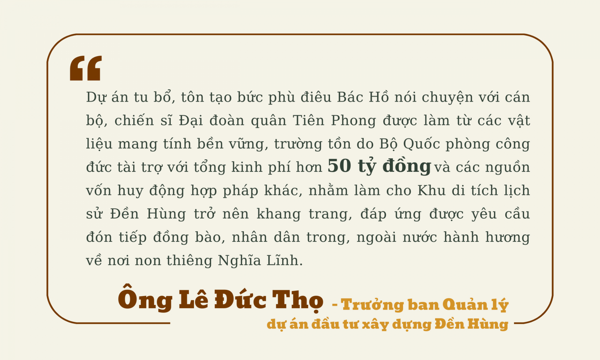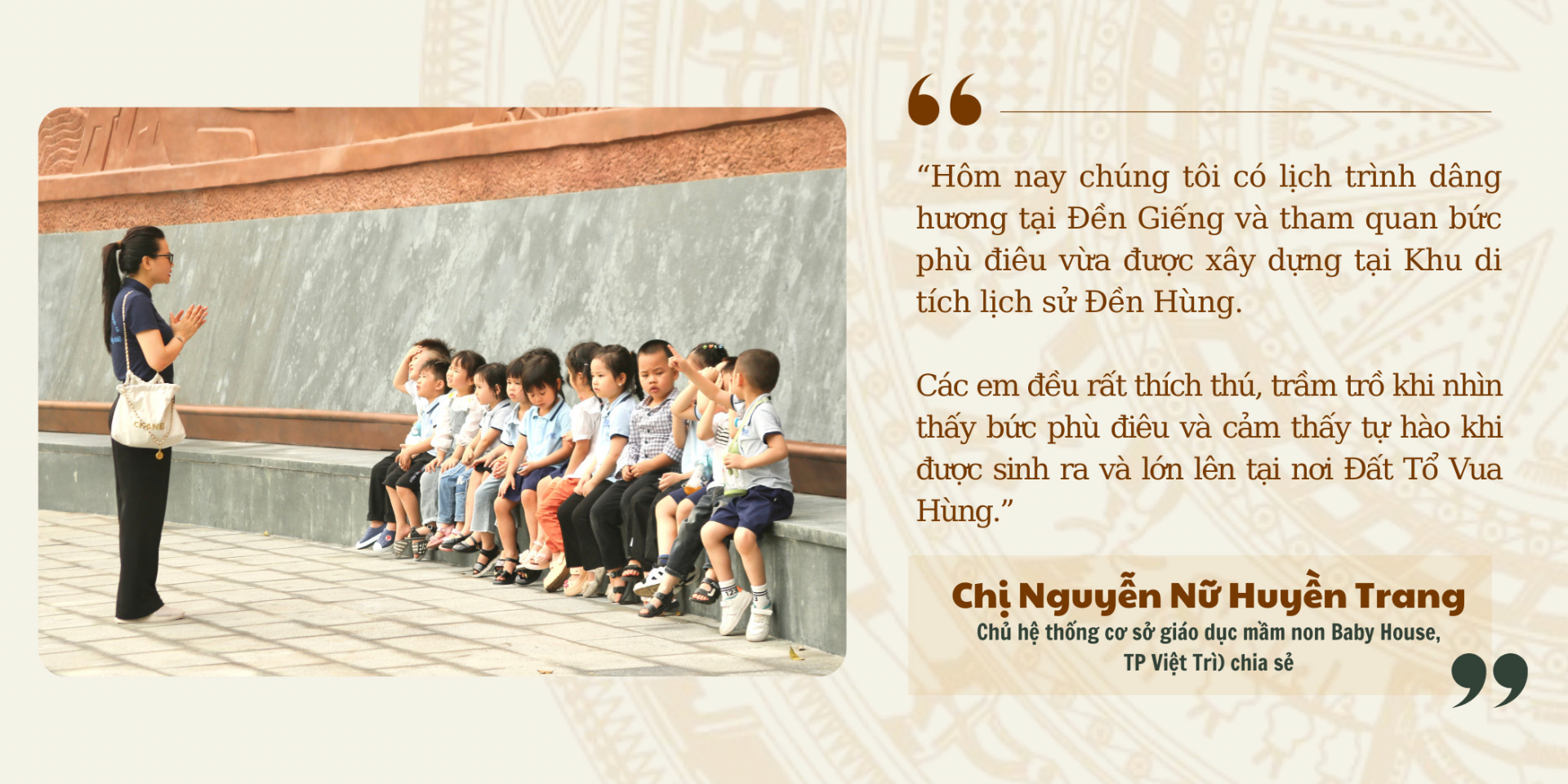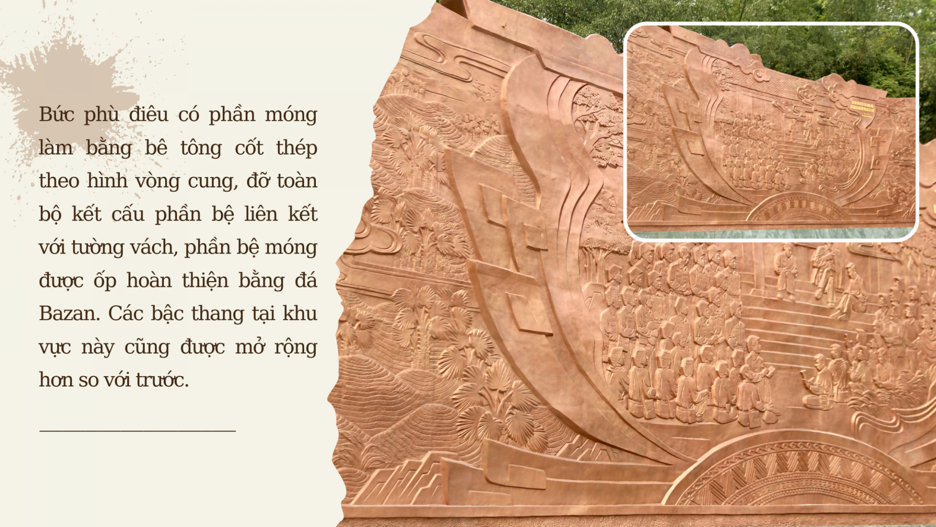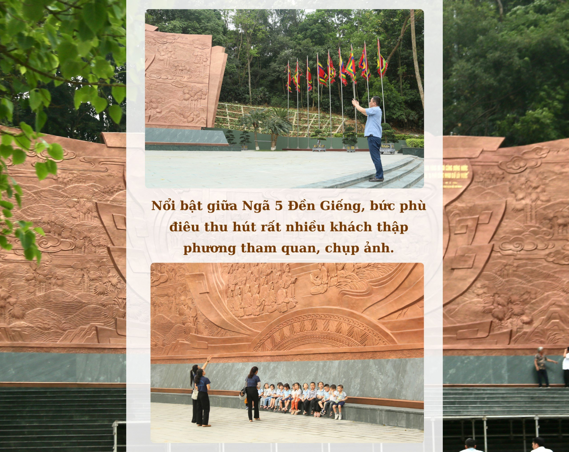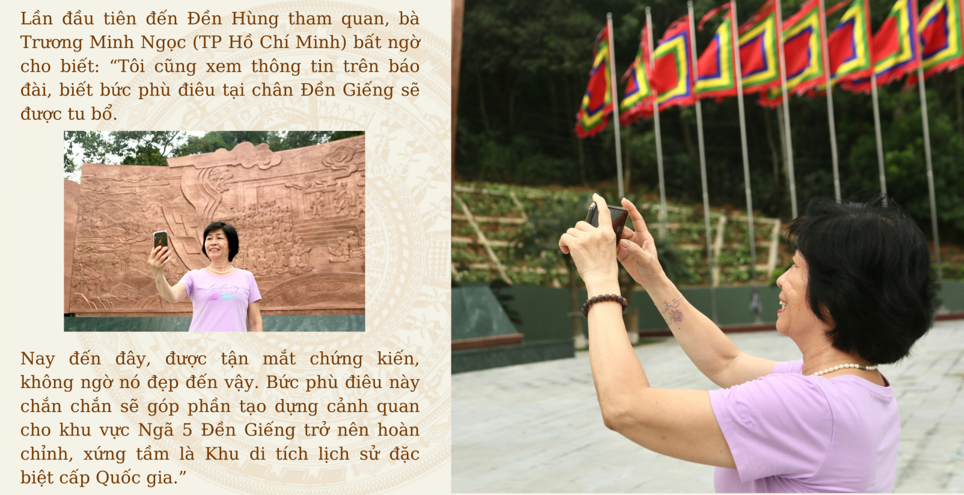 Ông Triệu Việt Tiến (Xã Hy Cương, TP Việt Trì) - người dân sinh sống gần Khu di tích lịch sử Đền Hùng ngắm nhìn bức phù điêu mới cho biết: “Tôi sống ở đây đã gần 40 năm, theo sự quan sát của tôi, trải qua hơn 20 năm, từ ngày bức phù điêu cũ khắc họa hình ảnh Bác Hồ nói chuyện với cán bộ, chiến sĩ Đại đoàn Quân Tiên Phong hoàn thành vào năm 2001 khi khu vực Ngã 5 Đền Giếng chỉ là một con đường nhỏ hẹp. Cho đến nay, bức phù điêu vẫn giữ được nguyên khối nhưng một số chỗ đã xuất hiện các vết nứt, vết ố, các công trình xung quanh cũng xuống cấp, không phù hợp với cảnh quan khang trang, rộng rãi như bây giờ".