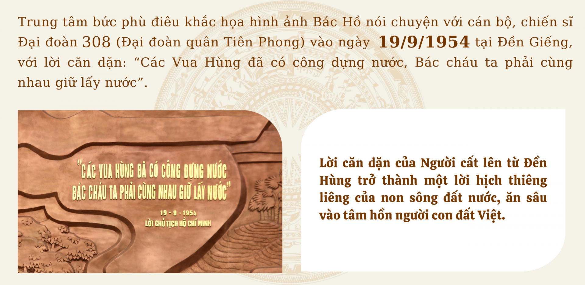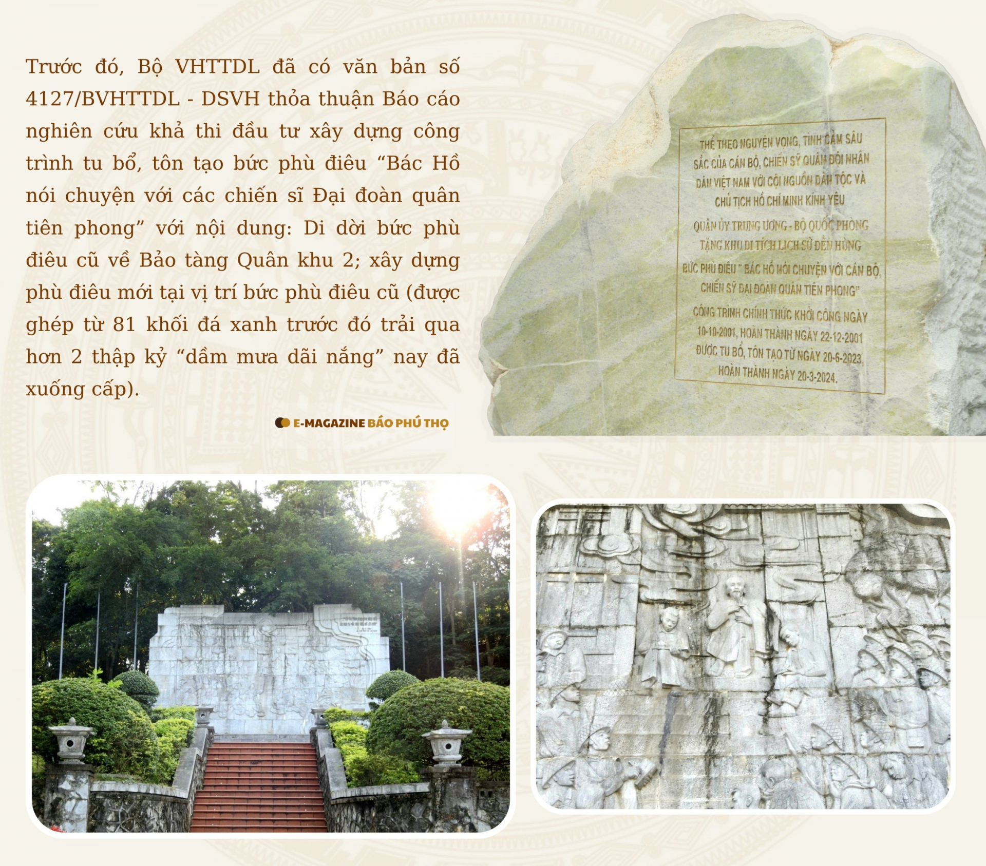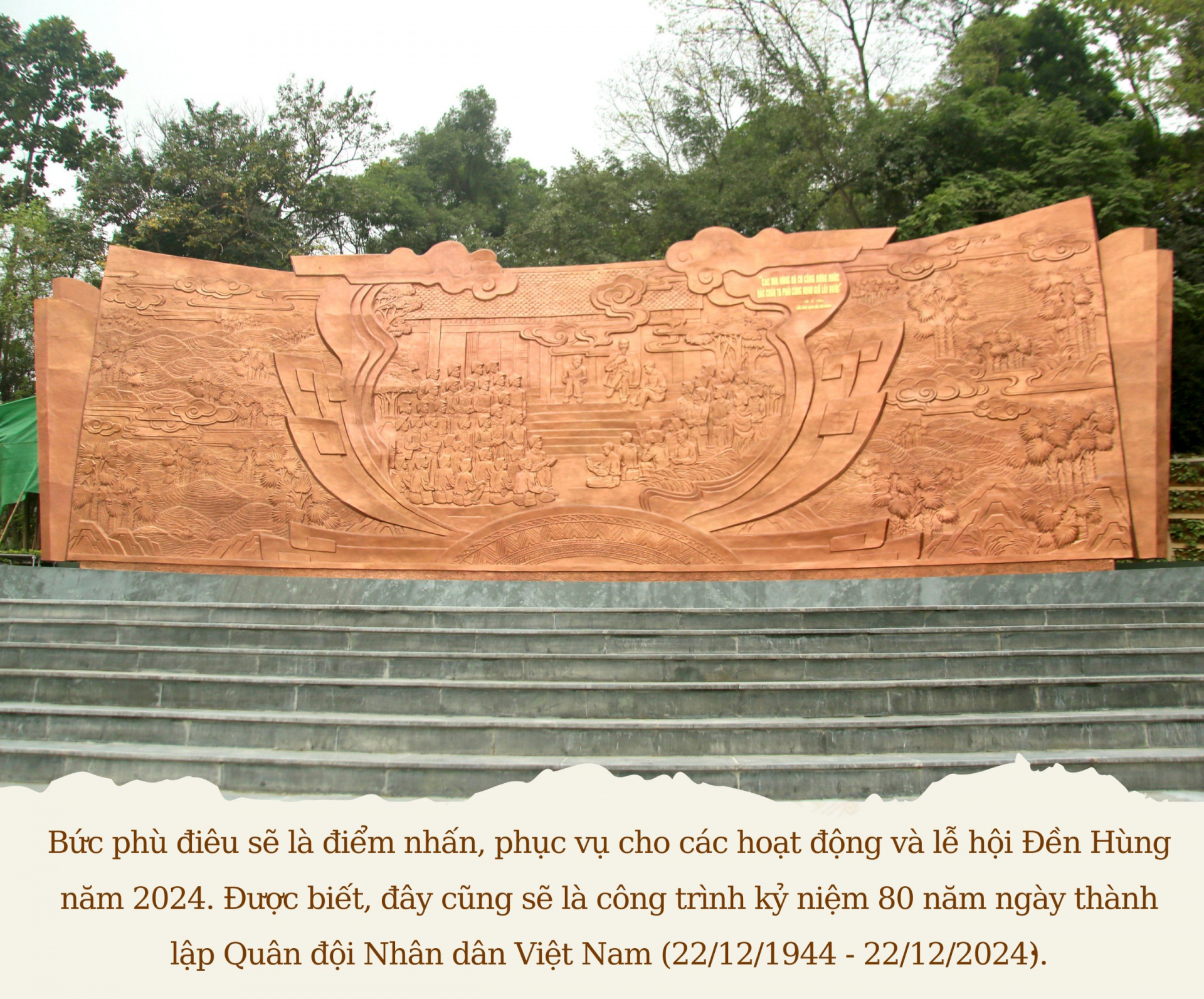 Bức phù điêu bằng chất liệu đồng “Bác Hồ nói chuyện với cán bộ, chiến sỹ Đại đoàn quân Tiên Phong” do Quân ủy Trung ương – Bộ quốc phòng tặng Khu di tích lịch sử Đền Hùng (xã Hy Cương, TP Việt Trì) đặt tại khu vực Ngã 5 Đền Giếng được khánh thành, đưa vào sử dụng đúng dịp Giỗ Tổ Hùng Vương năm 2024, nhằm phục vụ du khách thập phương, hành hương về Đất Tổ.
