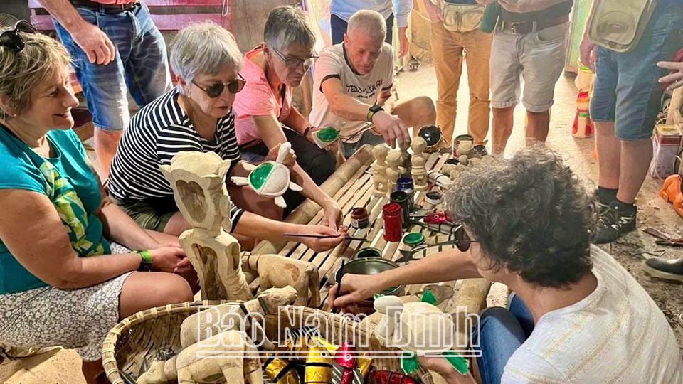 | Khách du lịch quốc tế trải nghiệm nghề làm rối nước tại xã Hồng Quang (Nam Trực). |