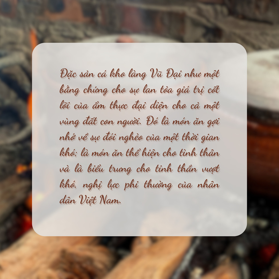 Với bí quyết chế biến cổ truyền được gìn giữ từ đời này qua đời khác, cha truyền con nối, dần dần, đặc sản cá kho làng Vũ Đại trở thành người bạn đồng hành, cầu nối giúp quảng bá rộng rãi ẩm thực Việt Nam tới các thực khách trong và ngoài nước.