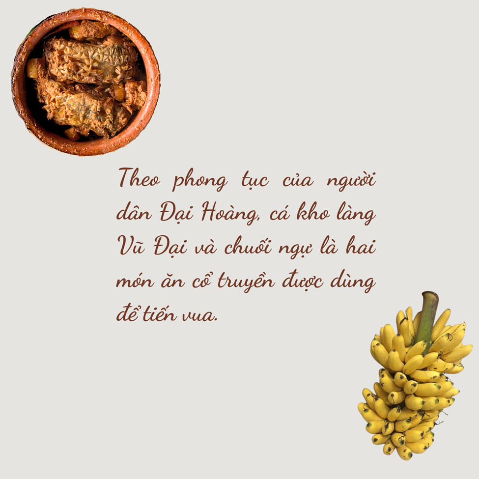 Vì nghèo đói quanh năm nên vào những ngày đầu năm tiến vua, người dân nơi đây thường làm những món cá kho và lựa chọn những nải chuối ngự đẹp mắt và ngon nhất để dâng lên vua chúa. Họ đã chế biến món cá một cách kỳ công và tỉ mỉ nhất để tỏ lòng thành kính với vua chúa thời bấy giờ. Chính vì vậy, cho đến hiện nay món cá kho này vẫn rất nổi tiếng và được mệnh danh là “cá kho Tiến Vua”.