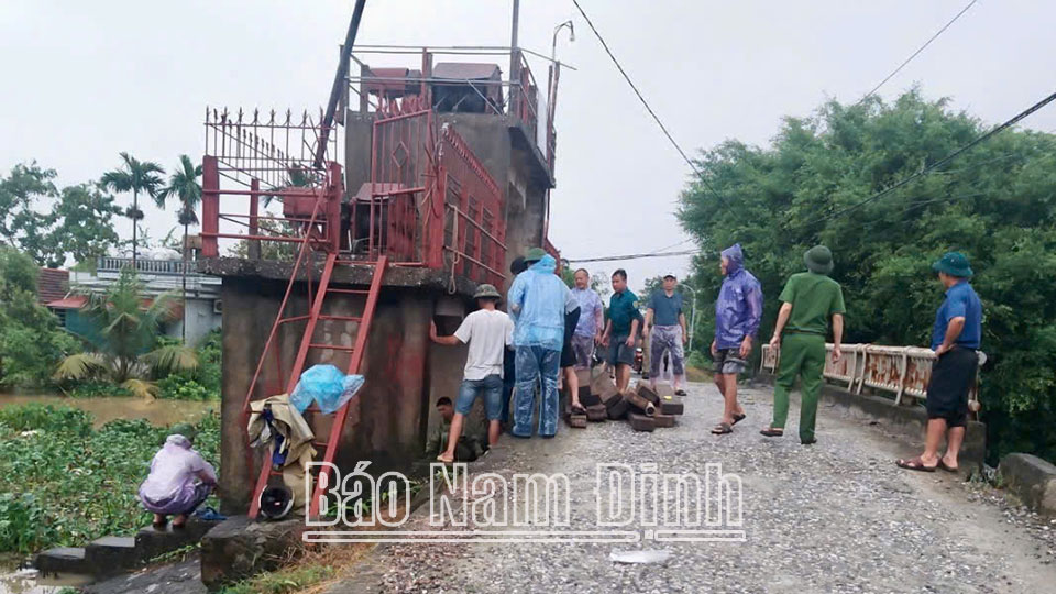 | Công ty TNHH MTV Khai thác công trình thủy lợi huyện Nghĩa Hưng phối hợp với lực lượng chức năng xã Nghĩa Hồng gia cố cống Bình Hải 1 (cống dưới đê Tả Đáy). |