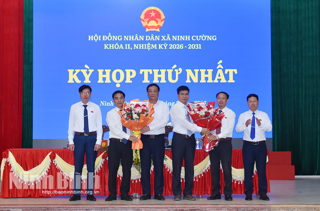 Lãnh đạo Ban Văn hóa Xã hội HĐND tỉnh và lãnh đạo Đảng ủy xã Ninh Cường tặng hoa chúc mừng các đồng chí được bầu giữ các chức danh chủ chốt HĐND xã khóa II, nhiệm kỳ 2026-2031. Ảnh: Minh Tân