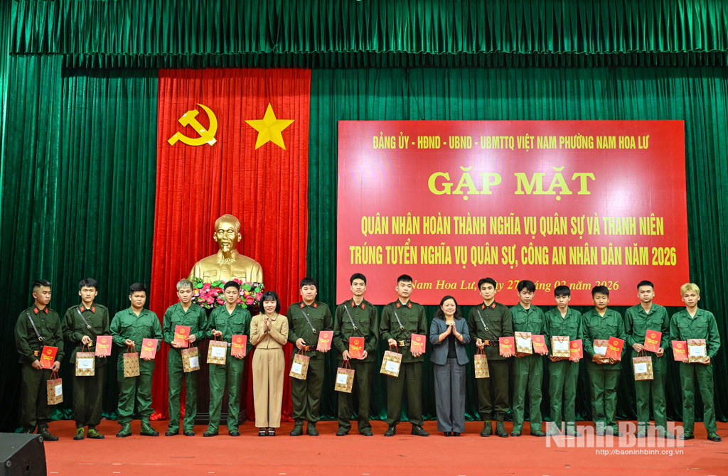Chiều 27/2, tại Nhà văn hóa phường, Đảng ủy, HĐND, UBND, Ủy ban MTTQ Việt Nam phường Nam Hoa Lư tổ chức gặp mặt quân nhân hoàn thành nghĩa vụ quân sự và thanh niên trúng tuyển nghĩa vụ quân sự, công an nhân dân năm 2026.