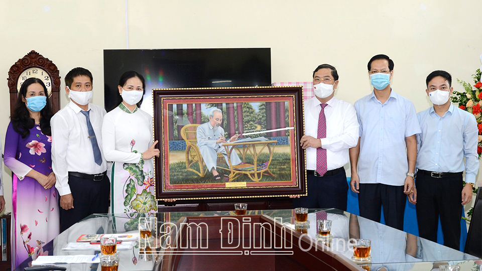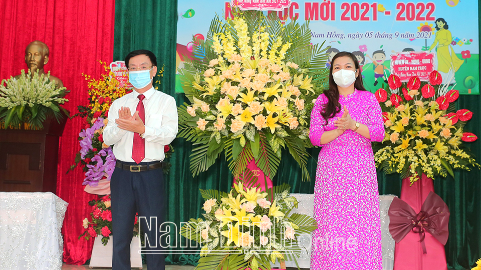 | Đồng chí Phạm Đình Nghị, Phó Bí thư Tỉnh ủy, Chủ tịch UBND tỉnh tặng giáo viên, học sinh Trường tiểu học Nam Hồng (Nam Trực) lẵng hoa tươi thắm nhân dịp năm học mới 2021-2022. Ảnh: Thu Thủy |