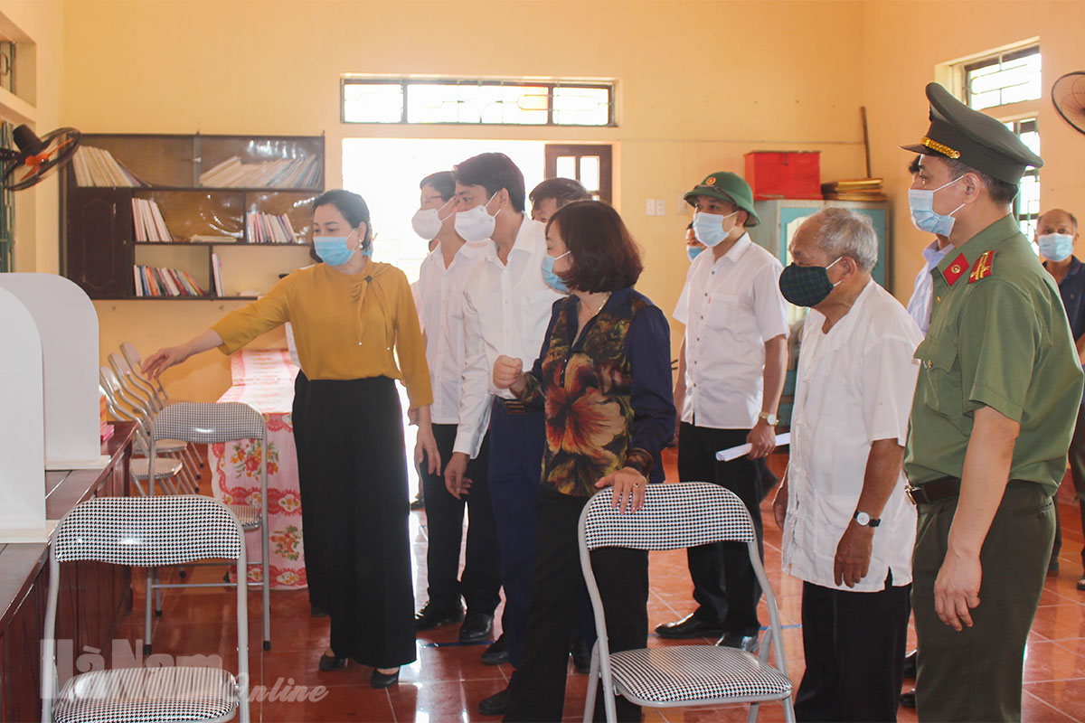 Cũng trong sáng nay, đồng chí Phó Bí thư Thường trực Tỉnh ủy Đinh Thị Lụa đã đi kiểm tra công tác chuẩn bị bầu cử đại biểu Quốc hội khóa XV, đại biểu HĐND các cấp nhiệm kỳ 2021-2026 tại xã Lê Hồ (Kim Bảng) và xã Thanh Thủy (Thanh Liêm). Qua kiểm tra, đồng chí Phó Bí thư Thường trực Tỉnh ủy Đinh Thị Lụa đã ghi nhận, đánh giá cao công tác chuẩn bị bầu cử của các địa phương. Đồng thời, đồng chí yêu cầu các địa phương nhanh chóng rà soát, hoàn tất các điều kiện về cơ sở vật chất, in ấn tài liệu, bố trí lối ra, vào một chiều, chuẩn bị đầy đủ khẩu trang, nước sát khuẩn đặt tại vị trí thuận tiện tại khu vực bỏ phiếu để phục vụ công tác bầu cử theo đúng quy định. Các điểm bầu cử phải thực hiện nghiêm thông điệp 5K của Bộ Y tế trong quá trình diễn ra bầu cử; thực hiện khai báo y tế cho cử tri, kiểm tra thân nhiệt, đảm bảo khoảng cách an toàn giữa các cử tri trong quá trình bỏ phiếu, không tập trung đông người tại điểm bầu cử. Tại các điểm bầu cử phải bố trí phòng cách ly, khi phát hiện người nghi nhiễm sẽ thực hiện cách ly kịp thời nhằm đảm bảo tốt công tác phòng dịch trong ngày bầu cử.