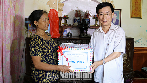 | Đồng chí Phạm Đình Nghị, Phó Bí thư Tỉnh uỷ, Chủ tịch UBND tỉnh thăm, tặng quà gia đình bà Trần Thị Suốt là mẹ liệt sĩ ở Thị trấn Gôi, huyện Vụ Bản. |