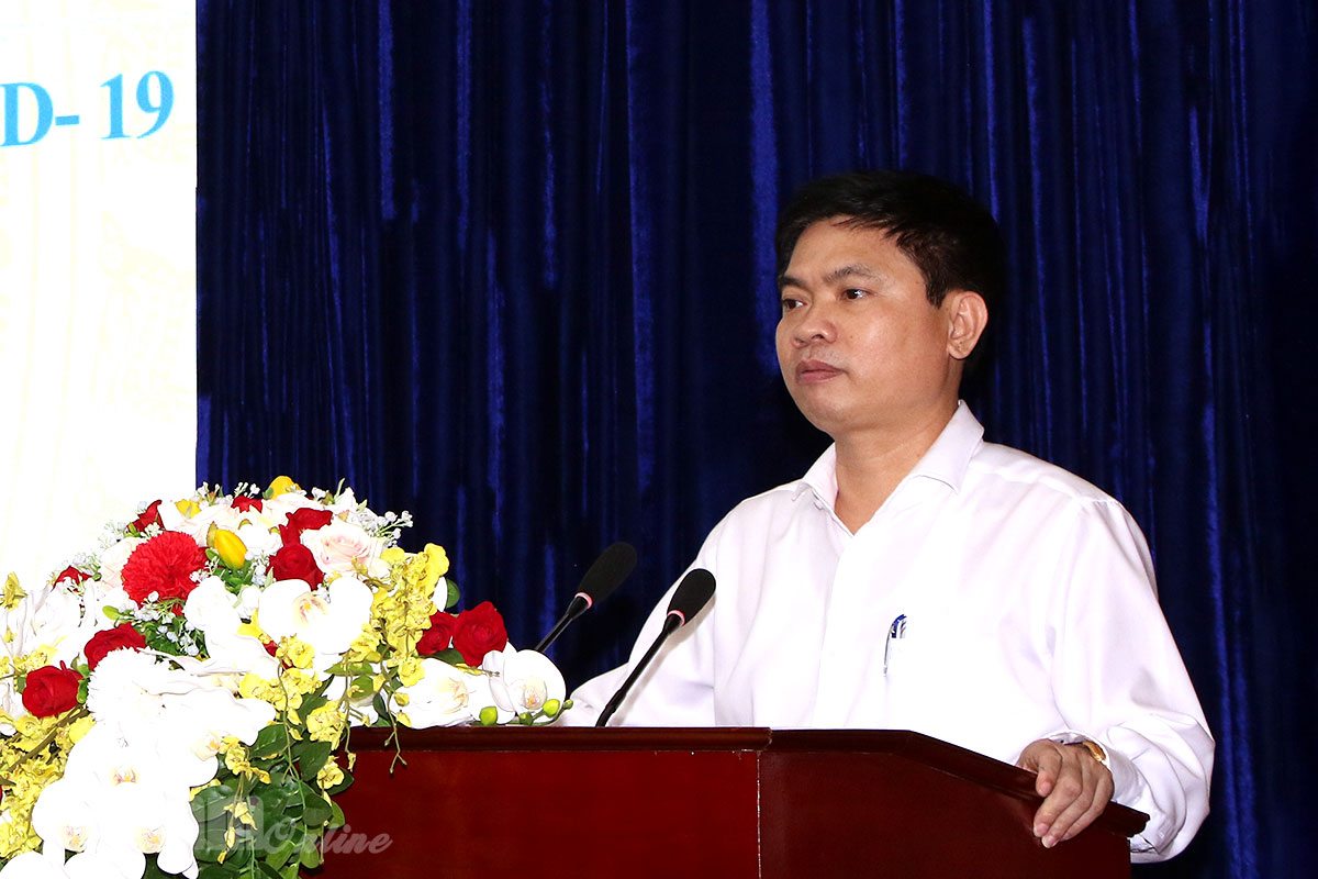 Đồng chí Trương Quốc Huy, Phó Bí thư Tỉnh uỷ, Chủ tịch UBND tỉnh, Trưởng đoàn Đại biểu Quốc hội tỉnh, Trưởng Ban Chỉ đạo phòng, chống dịch Covid–19 tỉnh phát biểu tại hội nghị.