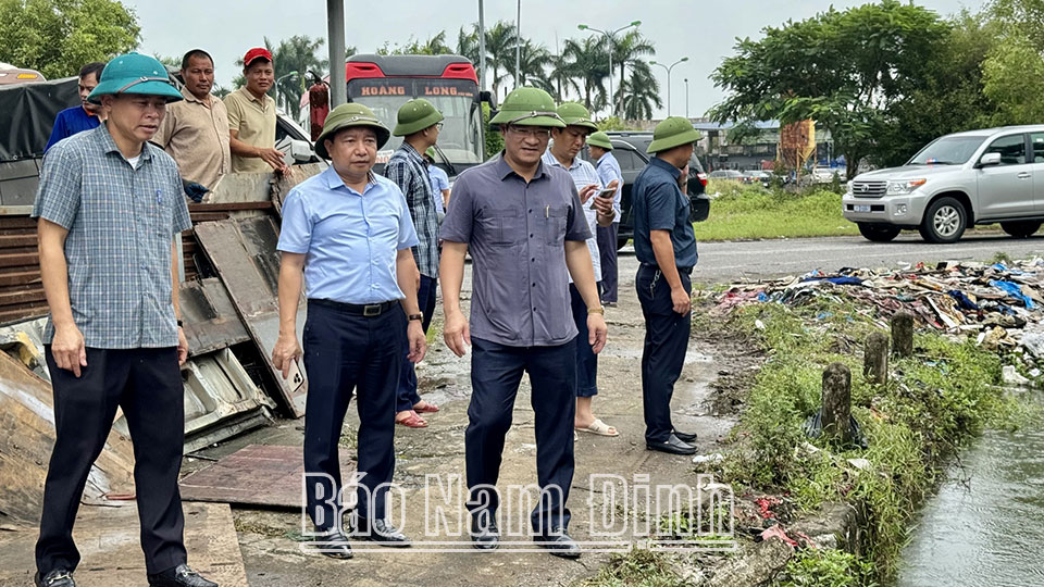 | Đồng chí Trần Anh Dũng, Ủy viên Ban TVTU, Phó Chủ tịch Thường trực UBND tỉnh kiểm tra công tác tiêu thoát nước nội đô thành phố Nam Định. |