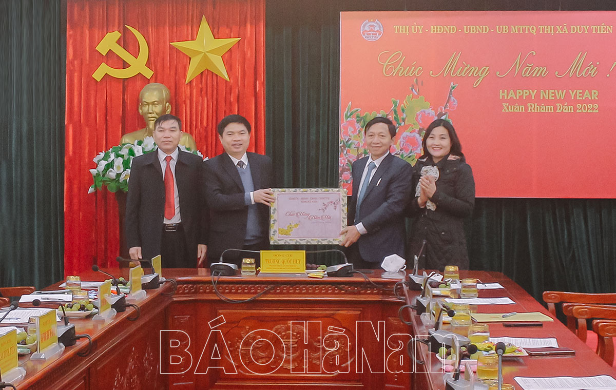 Đồng chí Trương Quốc Huy, Phó Bí thư Tỉnh ủy, Chủ tịch UBND tỉnh đã biểu dương, ghi nhận và đánh giá cao công tác tổ chức vui Xuân, đón Tết cho người dân và thực hiện nhiệm vụ phát triển kinh tế - xã hội trong những ngày đầu năm mới của thị xã Duy Tiên, đồng thời gửi lời chúc Xuân mới, thắng lợi mới tới toàn thể cán bộ, đảng viên và nhân dân thị xã trong năm mới Nhâm Dần 2022. Đồng chí Chủ tịch UBND tỉnh nhấn mạnh: Năm 2022 là năm bản lề hết sức quan trọng để thực hiện Nghị quyết Đại hội XIII của Đảng và đại hội Đảng các cấp nên ngay sau Tết, thị xã Duy Tiên cần triển khai thực hiện tốt các nhiệm vụ chính trị theo kế hoạch. Trong đó, tập trung thực hiện hiệu quả công tác phòng, chống dịch Covid -19, đẩy nhanh tiến độ tiêm vắc xin phòng Covid -19 cho người dân, phấn đấu hoàn thành tiêm mũi 3 cho người từ 18 tuổi trở lên trước 25/2. Bên cạnh đó, tiến hành rà soát, nắm bắt tình hình hoạt động của các doanh nghiệp tại các khu, cụm công nghiệp trên địa bàn để có biện pháp tháo gỡ khó khăn, tạo điều kiện thuận lợi cho doanh nghiệp phát triển sản xuất; quan tâm đầu tư xây dựng cơ sở hạ tầng, xây dựng các trường học tại các khu vực có đông công nhân lao động tạm trú để nâng cao chất lượng đời sống cho người dân.
