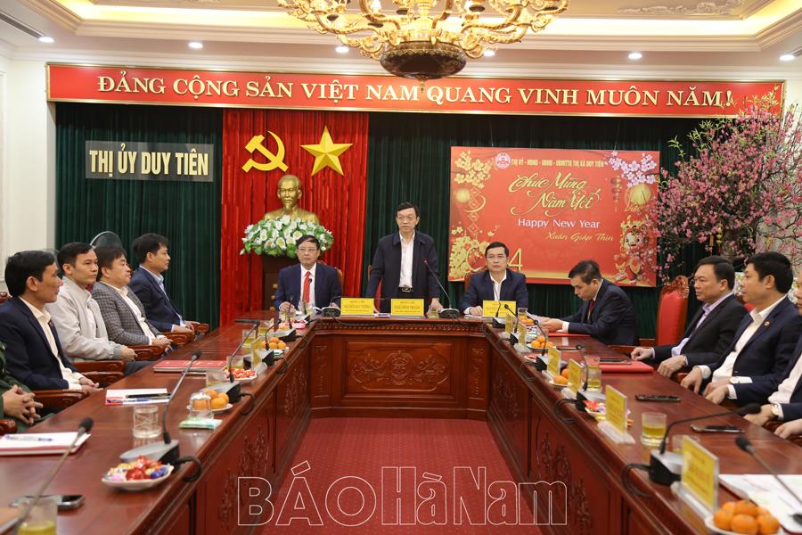 Phát biểu chỉ đạo tại buổi kiểm tra sản xuất đầu xuân mới, đồng chí Đặng Đình Thoảng, Ủy viên Ban Thường vụ Tỉnh ủy, Trưởng Ban Tổ chức Tỉnh ủy đã biểu dương, đánh giá cao công tác tổ chức vui Xuân đón Tết Giáp Thìn, nhất là công tác an sinh xã hội và kiểm soát tốt được an ninh trật tự, an toàn giao thông của thị xã Duy Tiên... Về nhiệm vụ trong thời gian tới, thị xã tập trung lãnh đạo, chỉ đạo thực hiện những nhiệm vụ sau: Đẩy mạnh tuyên truyền mừng Đảng, mừng Xuân tạo niềm tin, khí thế phấn khởi trong cán bộ, đảng viên và nhân dân thực hiện thắng lợi nhiệm vụ năm 2024; triển khai nghiêm túc các nhiệm vụ theo kế hoạch đề ra ngay từ tháng đầu, quý đầu; quán triệt, triển khai thực hiện các chương trình, nghị quyết của Đảng đảm bảo thực hiện thắng lợi Nghị quyết Đại hội Đảng bộ thị xã nhiệm kỳ 2020 – 2025; tổ chức thực hiện các phong trào thi đua rộng khắp trên địa bàn thị xã; nắm bắt tình hình đảm bảo đời sống nhân dân, công nhân, nguồn cung lao động trong các khu công nghiệp trên địa bàn; tập trung xây dựng kế hoạch triển khai quy hoạch tỉnh đã được công bố; đẩy mạnh sản xuất nông nghiệp, trọng tâm là gieo cấy vụ lúa xuân 2024; chuẩn bị tốt tổ chức lễ hội Tịch điền; Lễ giao nhận quân năm 2024…
