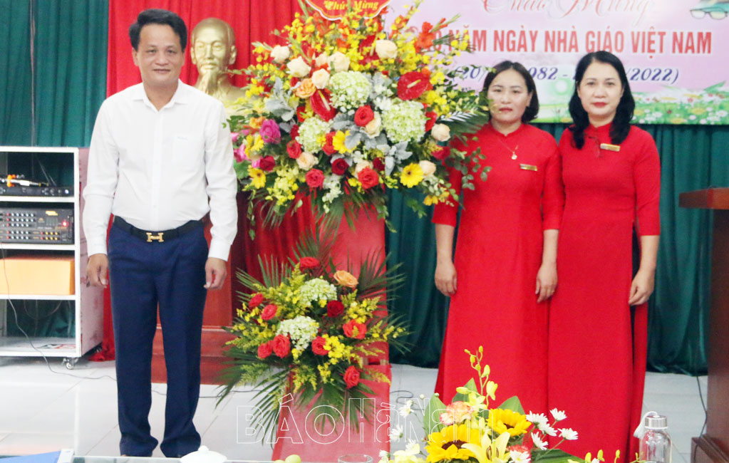 Thay mặt Tỉnh ủy, HĐND, UBND tỉnh, đồng chí Đào Đình Tùng, Ủy viên BTV Tỉnh ủy, Trưởng Ban Nội chính Tỉnh ủy tặng hoa chúc mừng thầy cô giáo, học sinh nhà trường nhân dịp kỷ niệm 40 năm Ngày Nhà giáo Việt Nam.