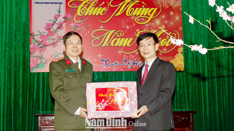 Đồng chí Chủ tịch UBND tỉnh biểu dương những thành tích của cán bộ, chiến sĩ Công an Thành phố Nam Định đạt được trong thời gian qua; trong đó tập trung lực lượng, triển khai đồng bộ các biện pháp công tác, tấn công, trấn áp các loại tội phạm, đảm bảo an ninh trật tự cho nhân dân vui Tết, đón Xuân. Đồng chí Chủ tịch UBND tỉnh gửi lời chúc Tết tới toàn thể cán bộ, chiến sĩ Công an Thành phố Nam Định và mong các đồng chí tập trung cao độ đảm bảo an toàn trong và sau Tết Nguyên đán Kỷ Hợi 2019, Lễ Khai ấn Đền Trần, thực hiện tốt các giải pháp đảm bảo an ninh trật tự, xứng đáng với sự quan tâm, niềm tin yêu, mong đợi của Đảng bộ, quân và dân thành phố.
