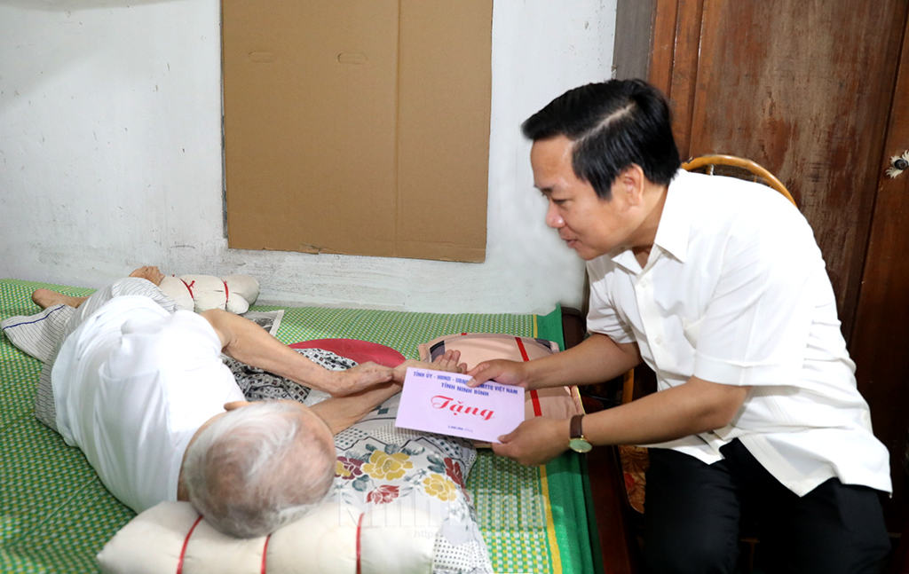 Đồng chí Chủ tịch UBND tỉnh và đoàn đã đến thăm, tặng quà ông Lương Đắc Bằng, 96 tuổi, ở tổ 13, phường Trung Sơn, thành phố Tam Điệp. Ông Bằng tham gia cách mạng tháng từ 8/1943, vào Đảng năm 1949. Ông có 5 người con. Các con của ông đều đã trưởng thành, lập gia đình riêng. Hiện ông sống một mình, vợ đã mất, hàng ngày được con gái sống ở gần qua chăm sóc.