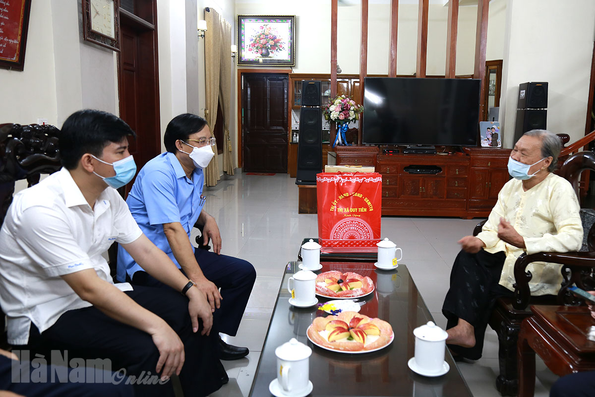 * Sáng ngày 22/7, đoàn do đồng chí Nguyễn Đức Vượng, Tỉnh ủy viên, Phó Chủ tịch UBND tỉnh làm trưởng đoàn đã đi thăm, tặng quà gia đình bà Phạm Thị Vân Thành, tổ dân phố số 1, phường Hòa Mạc, thương binh 4/4; bà Nguyễn Thị Thế, thôn Trường Thụy 2, xã Trác Văn, gia đình liệt sỹ tiêu biểu; ông Nguyễn Ngọc Đa, thôn Lỗ Hà, xã Chuyên Ngoại, nhiễm chất độc hóa học có hoàn cảnh khó khăn của thị xã Duy Tiên.