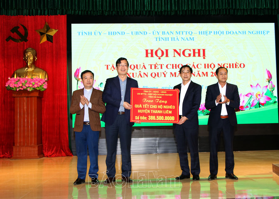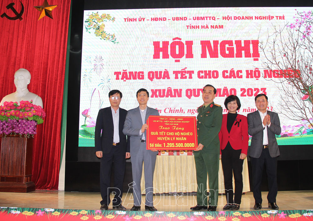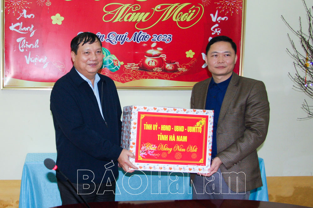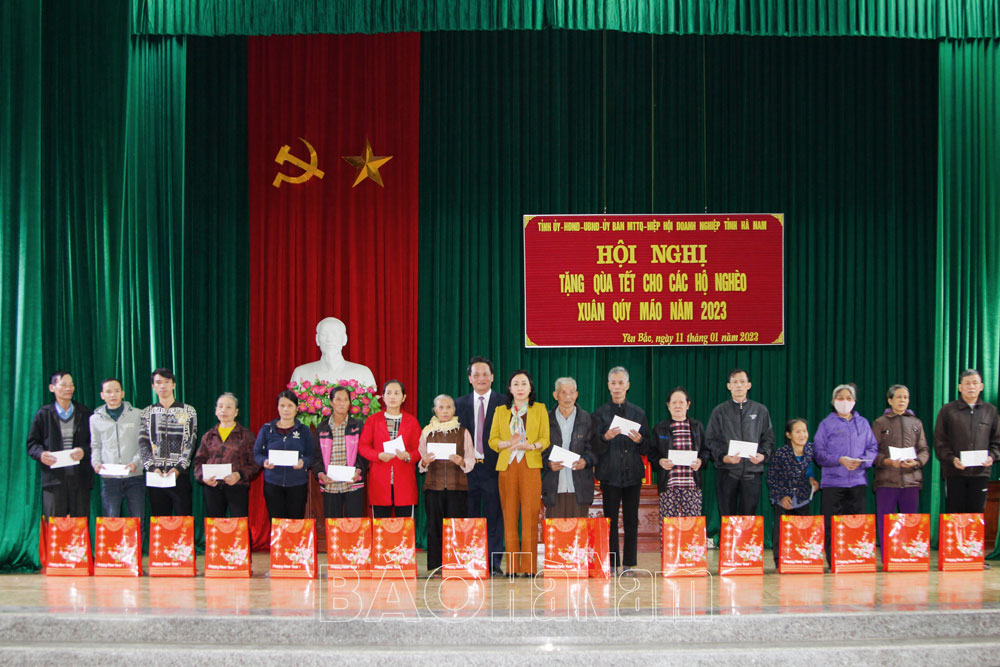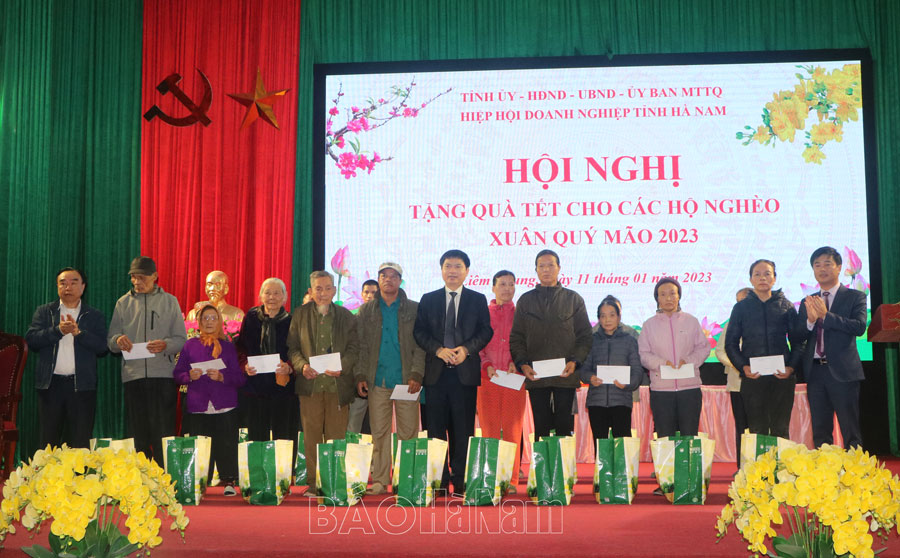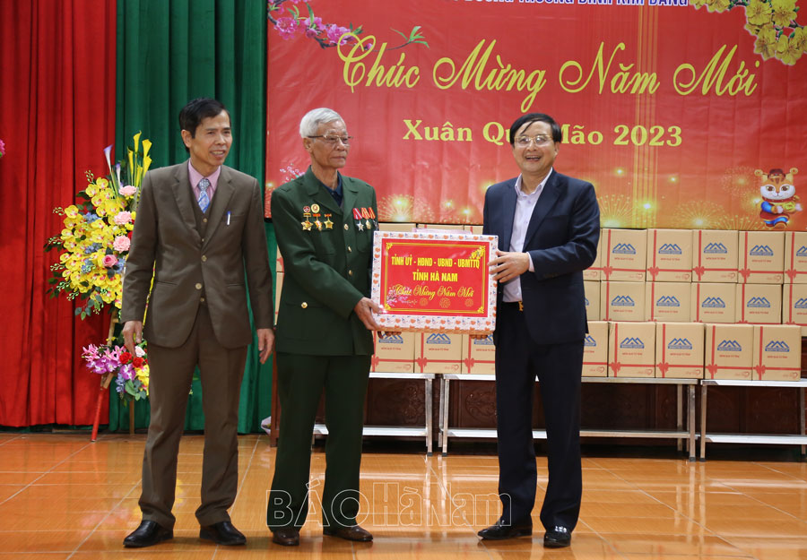 Tại đây, đồng chí Bí thư Tỉnh ủy cũng thông tin nhanh những kết quả nổi bật trong phát triển kinh tế - xã hội của tỉnh năm 2022. Đồng thời cho biết, theo chuẩn nghèo đa chiều giai đoạn 2022-2025, Hà Nam còn 7.570 hộ nghèo, chiếm tỷ lệ 2,69%; 7.528 hộ cận nghèo, chiếm tỷ lệ 2,67% và nhiều hộ gia đình có hoàn cảnh khó khăn do ảnh hưởng của dịch bệnh. Nhân dịp Tết Quý Mão 2023, tỉnh hỗ trợ gần 1 tỷ đồng và hơn 18.000kg gạo cho 1.811 hộ nghèo tại Bình Lục, trong đó mỗi hộ nghèo được nhận 500.000 đồng và 5kg gạo nếp, 5kg gạo tẻ.
