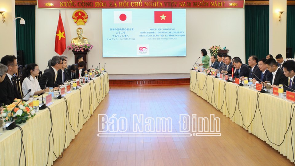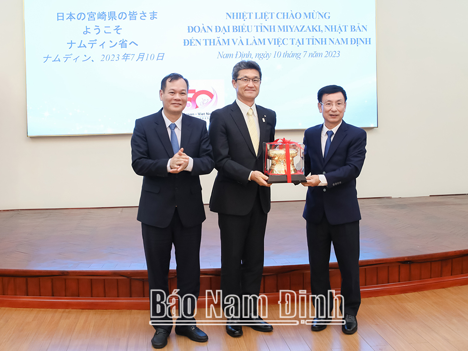 Ngày 10-7, Đoàn đại biểu tỉnh Miyazaki (Nhật Bản) do ông Kono Shunji, Thống đốc tỉnh Miyazaki làm Trưởng đoàn sang thăm và làm việc với tỉnh Nam Định nhằm đánh giá các kết quả hợp tác giữa hai tỉnh trong thời gian qua, triển khai các nội dung hợp tác trong thời gian tới.