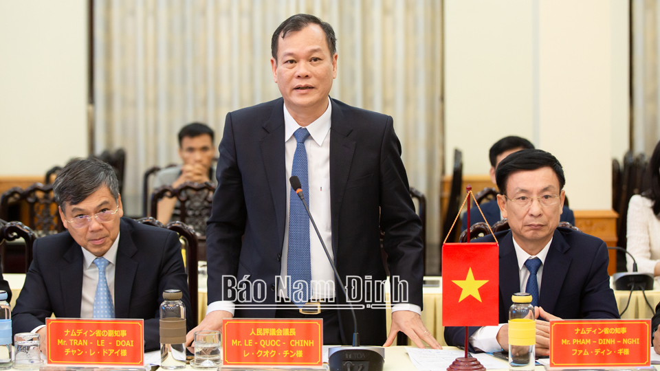 Phát biểu tại buổi làm việc, đồng chí Phó Bí thư Thường trực Tỉnh ủy Lê Quốc Chỉnh nhấn mạnh, đây là chuyến thăm thứ hai kể từ khi hai tỉnh Nam Định và Miyazaki ký kết hợp tác hữu nghị năm 2015. Thông qua hoạt động thăm hỏi đúng vào dịp hai nước đang kỷ niệm 50 năm thiết lập quan hệ Việt Nam và Nhật Bản, giúp hai tỉnh nắm bắt rõ hơn về kết quả hợp tác, thực tế phát triển kinh tế - xã hội của tỉnh bạn và tiếp cận nhiều hơn các cơ hội hợp tác mới trên đa dạng lĩnh vực. Đồng chí Phó Bí thư Thường trực Tỉnh ủy cũng gửi lời chúc chính quyền và nhân dân tỉnh Miyazaki ngày càng đạt nhiều thắng lợi mới trong phát triển kinh tế - xã hội; chúc tình hữu nghị giữa hai nước Việt Nam và Nhật Bản, cũng như hai tỉnh Nam Định và Miyazaki ngày càng bền chặt và phát triển./.