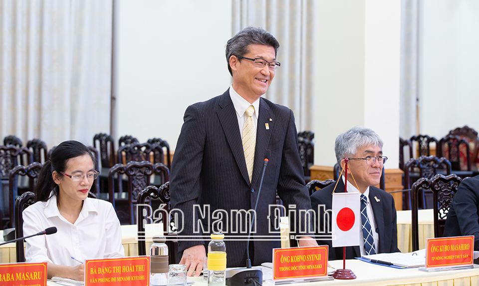 Phát biểu tại buổi làm việc, ông Kono Shunji, Thống đốc tỉnh Miyazaki cảm ơn các đồng chí lãnh đạo tỉnh đã dành cho Đoàn sự tiếp đón trọng thị, thân tình và hữu nghị. Đồng thời đánh giá cao kết quả hợp tác của hai tỉnh thời gian qua theo chương trình hợp tác 3 bên giữa tỉnh Nam Định với tỉnh Miyazaki và Trường Đại học Minami Kyushu. Thống đốc tỉnh Miyazaki mong muốn mối liên kết giữa hai tỉnh ngày càng tốt đẹp hơn để cùng nhau phát triển mạnh mẽ kinh tế - xã hội, nhất là trên lĩnh vực sản xuất, tiêu thụ sản phẩm nông nghiệp, giáo dục và đào tạo nhân lực ngành nông nghiệp…