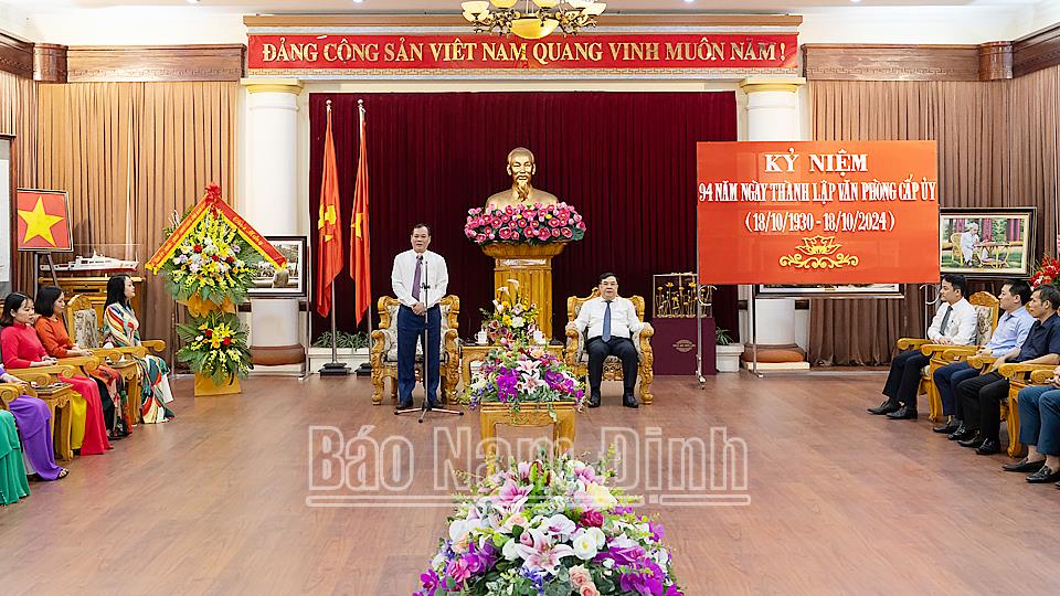 Đồng chí Phó Bí thư Thường trực Tỉnh ủy Lê Quốc Chỉnh ghi nhận, biểu dương, đánh giá cao những đóng góp của Văn phòng Tỉnh ủy trong thời gian qua. Đồng chí mong muốn Văn phòng Tỉnh ủy tiếp tục kế thừa truyền thống tốt đẹp của Văn phòng cấp ủy, phát huy những thành tích đã đạt được, tiếp tục đoàn kết, trách nhiệm, khắc phục mọi khó khăn, hoàn thành tốt nhiệm vụ chính trị được giao. Trong đó, tiếp tục đổi mới, nâng cao hiệu quả công tác tham mưu giúp cấp ủy lãnh đạo, chỉ đạo toàn diện các mặt công tác của Đảng bộ tỉnh kịp thời và có hiệu quả. Thực hiện tốt công tác quản lý tài chính, tài sản của Đảng, bảo đảm tiết kiệm, hiệu quả. Quan tâm xây dựng tập thể đoàn kết gắn bó, chăm lo đời sống vật chất, tinh thần cho cán bộ, công chức, người lao động.