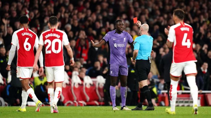 Trọng tài Anthony Taylor rút thẻ đỏ cho trung vệ Ibrahima Konate trong trận Arsenal thắng Liverpool 3-1 trên sân Emirates, thành phố London, vòng 23 Ngoại hạng Anh ngày 4/2/2024.