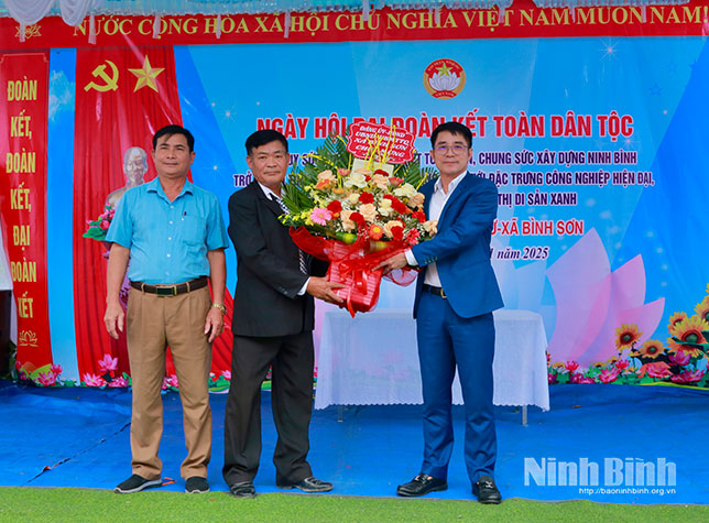 Lãnh đạo Đảng ủy xã Bình Sơn tặng hoa chúc mừng Ngày hội Đại đoàn kết toàn dân tộc tại thôn Mạnh Chư. Ảnh: Trần Giang