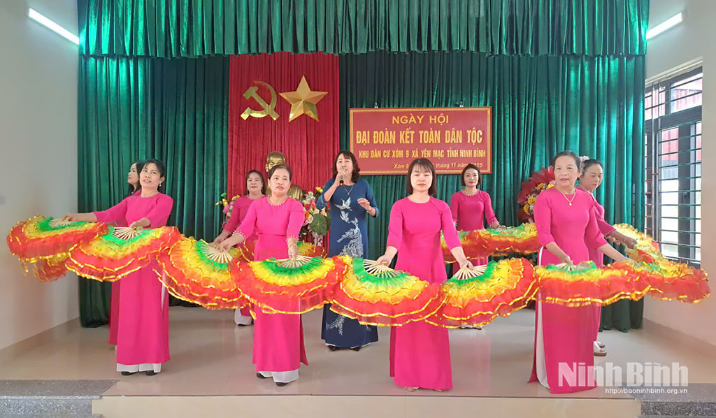 Biểu diễn văn nghệ chào mừng Ngày hội Đại đoàn kết toàn dân tộc tại xóm 9, xã Yên Mạc. Ảnh: Thủy Lam