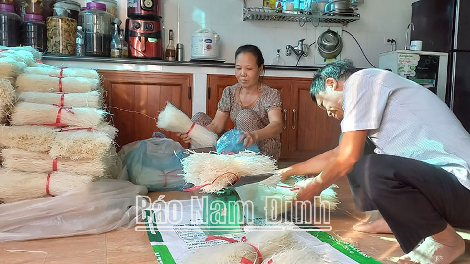 | Gia đình ông Nguyễn Viết Thịnh, xã Xuân Kiên (Xuân Trường) đóng gói sản phẩm miến gạo. |