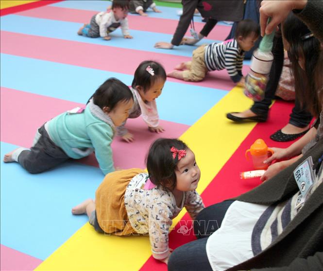 Các em bé tham gia cuộc thi bò tại một trung tâm thương mại ở Yokohama, Nhật Bản. Ảnh: Kyodo/TTXVN