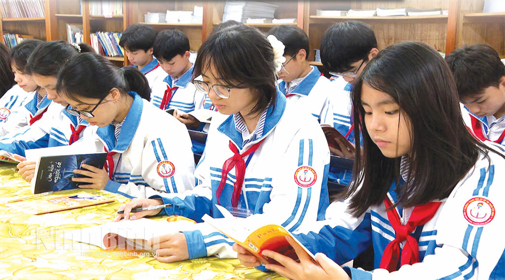 Cùng với đó, việc tiếp cận tài nguyên số được đưa vào một cách có định hướng. Nhà trường giới thiệu các nền tảng đọc sách điện tử, hướng dẫn học sinh tra cứu thông tin, khai thác nguồn học liệu mở. Thông điệp “Mỗi ngày đọc một trang sách - mở rộng tri thức, nuôi dưỡng ước mơ” được cụ thể hóa bằng những việc làm hằng ngày trong từng lớp học. Ở Trường THCS Yên Ninh (xã Yên Khánh), cách làm có thêm những “điểm nhấn” mới. Mô hình “Tủ sách xanh lớp học” được triển khai với sự tham gia của giáo viên, học sinh và phụ huynh. Mỗi lớp xây dựng một góc đọc riêng, trưng bày sách theo cách sáng tạo. Hoạt động giới thiệu sách do chính học sinh thực hiện, kết hợp trình diễn, trò chơi, câu hỏi tương tác, giúp việc đọc sách trở nên gần gũi, hấp dẫn hơn. Nhà trường tổ chức chấm thi giữa các lớp, tạo không khí thi đua tích cực.