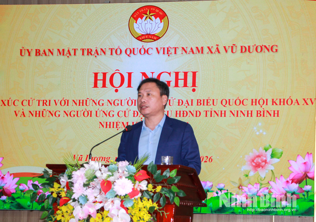 Tại hội nghị, đại diện Ủy ban MTTQ Việt Nam xã Vũ Dương đã giới thiệu tóm tắt tiểu sử, quá trình công tác của các ứng cử viên; các ứng cử viên trình bày chương trình hành động nếu được cử tri tín nhiệm bầu làm đại biểu HĐND tỉnh khóa XVI, nhiệm kỳ 2026-2031. Các ứng cử viên khẳng định, nếu trúng cử sẽ nỗ lực thực hiện tốt vai trò, trách nhiệm của mình; không ngừng rèn luyện, nâng cao bản lĩnh chính trị, trình độ chuyên môn, thực hiện vai trò, trách nhiệm và quyền hạn của người đại biểu dân cử; luôn nỗ lực hoàn thành tốt nhiệm vụ được giao. Đồng thời, cam kết sẽ giữ mối liên hệ chặt chẽ với cử tri và Nhân dân; lắng nghe, tiếp thu, chuyển tải trung thực, kịp thời kiến nghị của Nhân dân; tham gia thảo luận, quyết định những vấn đề quan trọng của địa phương, nhất là các chủ trương, giải pháp phát triển kinh tế - xã hội, bảo đảm an sinh xã hội, nâng cao đời sống Nhân dân, góp phần vào sự phát triển chung của tỉnh và địa phương.