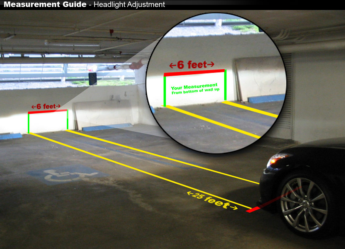 Sau khi đã đặt xe ở vị trí cân bằng và đầu xe hướng gần với tường chắn, hãy đo chiều cao từ mặt đất tới tim đèn pha của xe. Thông thường chiều cao này sẽ vào khoảng 1-1,1m.