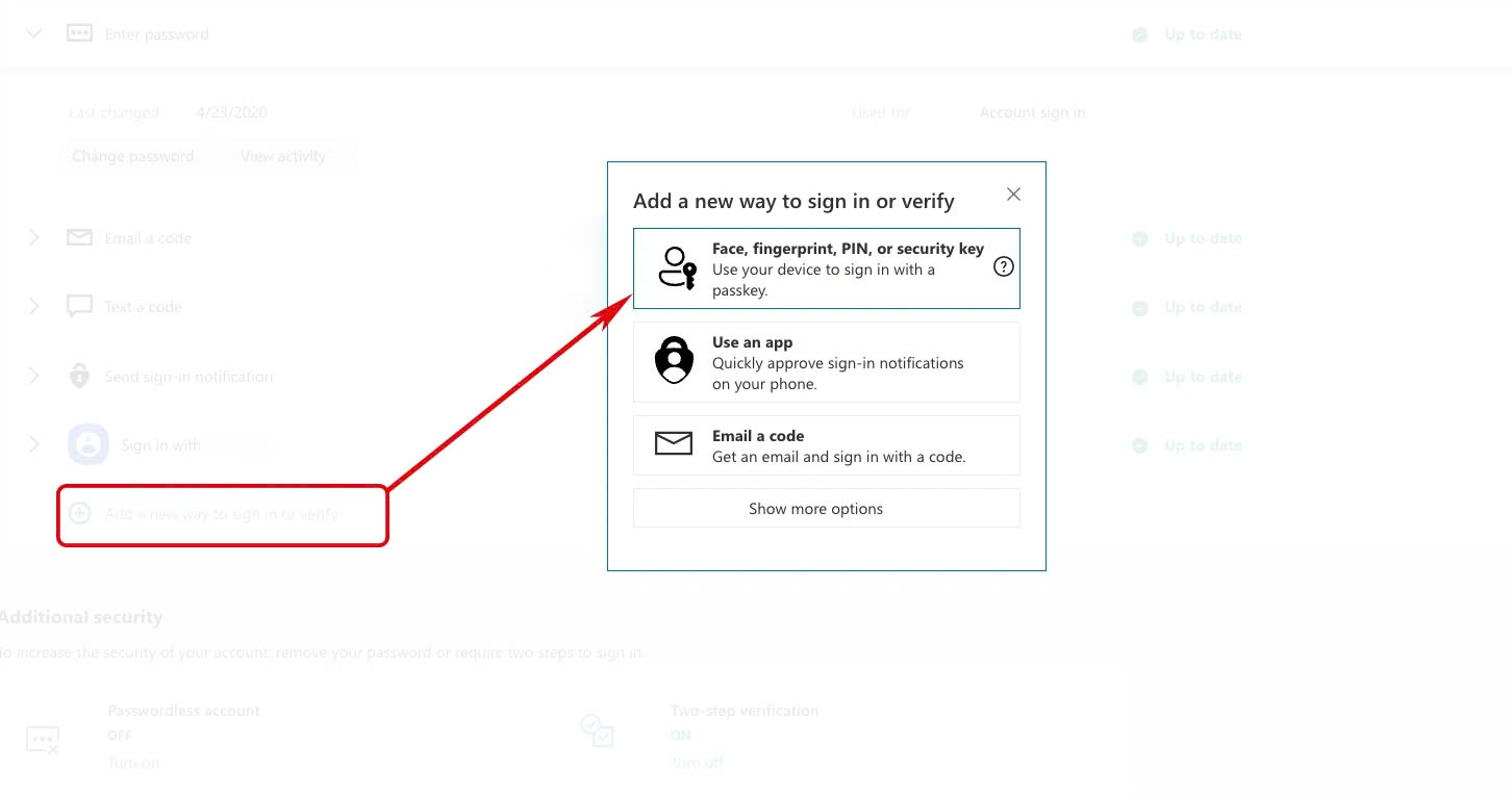 Một danh sách các phương thức xác thực sẽ được hiển thị. Tại đây, người dùng cần chọn tùy chọn có tên tương tự như Khuôn mặt, vân tay, mã PIN hoặc khóa bảo mật (Face, fingerprint, PIN, or security key). Lựa chọn này chính là điểm khởi đầu cho việc tạo Passkey.