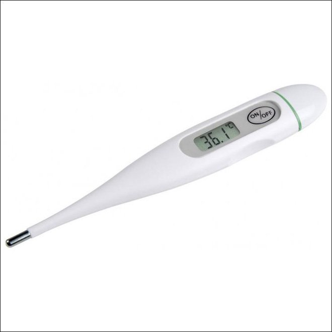 2. Nhiệt kế điện tử Loại nhiệt kế điện tử hoạt động dựa vào cảm ứng nhiệt tại các vùng tiếp xúc với đầu nhiệt kế. Nhiệt kế điện tử dùng để đo tại nách, miệng hay hậu môn, hiển thị thông số bằng điện tử có đèn led dễ đọc hơn nhiệt kế thủy ngân và có tiếng báo khi xong. Nhiệt kế điện tử đo nhiệt độ cơ thể bằng tia hồng ngoại, thời gian tiếp xúc để lấy kết quả chưa đến 30 giây, độ an toàn cao hơn.