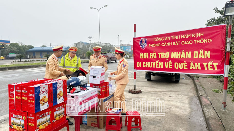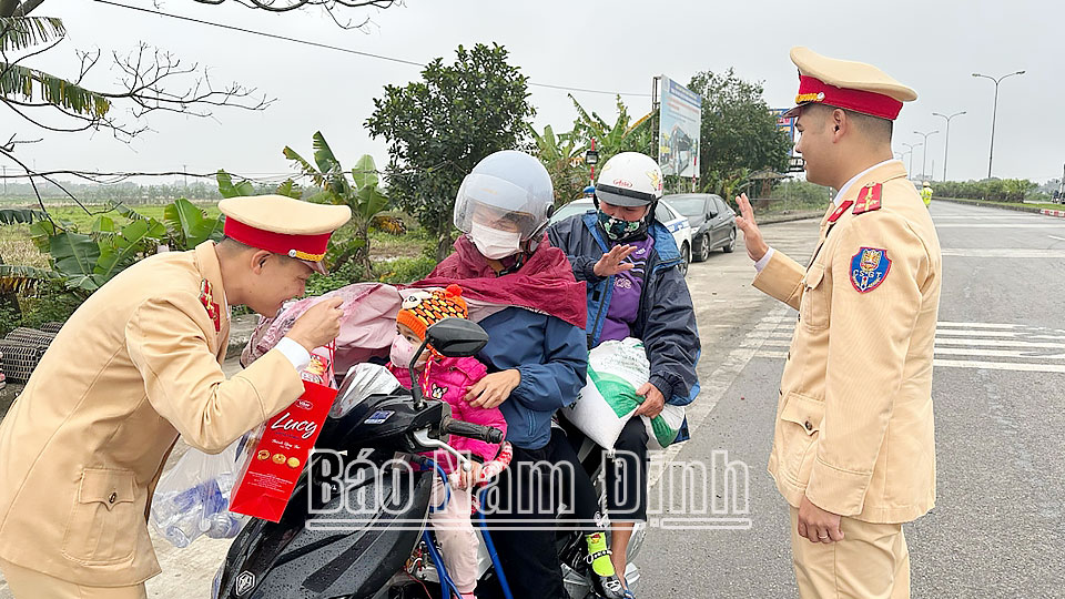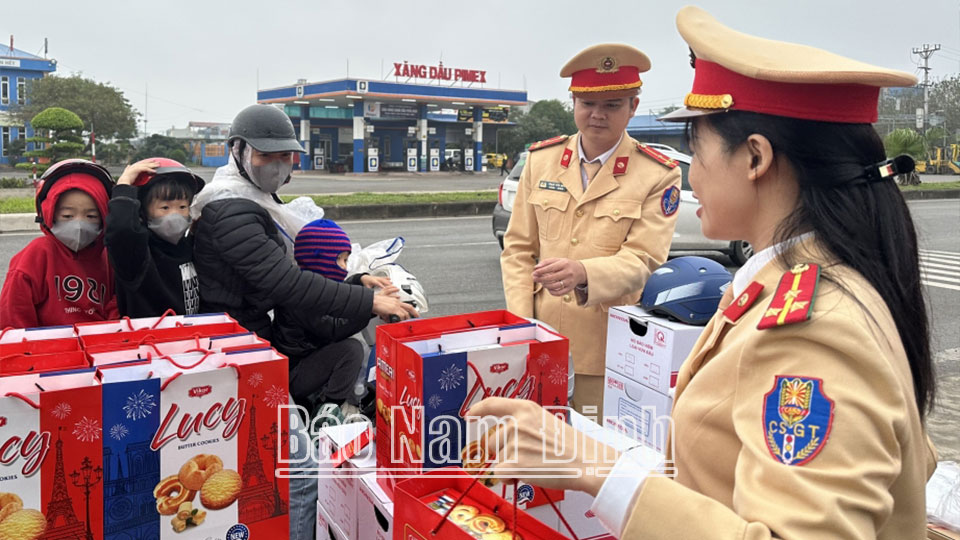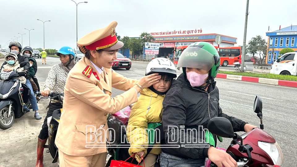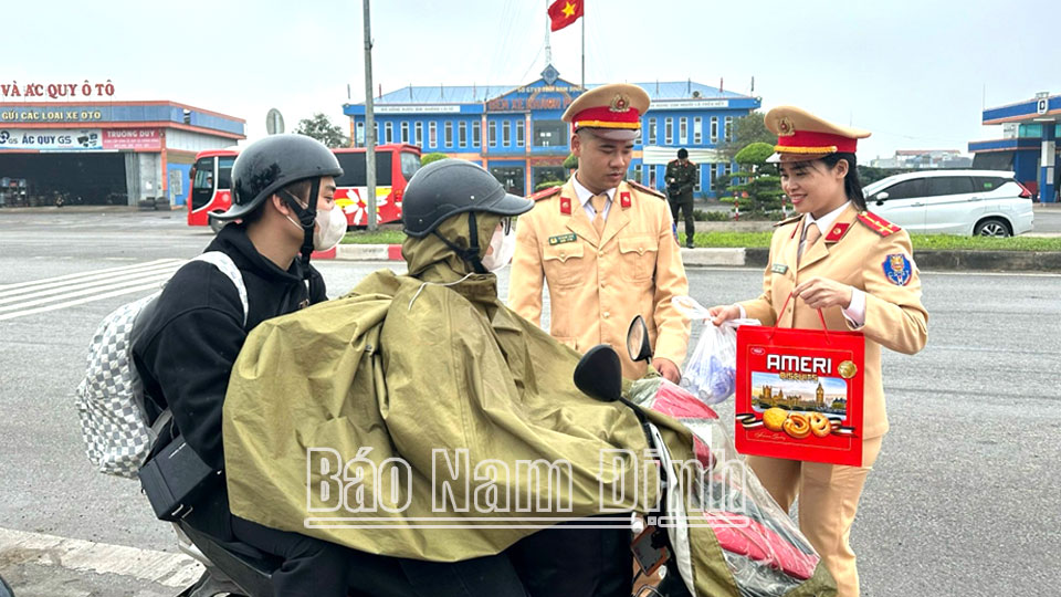 Cùng với việc tăng cường lực lượng tham gia đảm bảo trật tự an toàn giao thông trên các tuyến quốc lộ, tỉnh lộ và tại các nút giao, cửa ngõ giao thông ra, vào địa bàn tỉnh những ngày giáp Tết nguyên đán, trên Quốc lộ 21, đoạn qua xã Nghĩa An (Nam Trực), cán bộ, chiến sĩ Phòng Cảnh sát Giao thông đã tổ chức cấp phát gần 200 túi quà, 30 chiếc mũ bảo hiểm cho người dân về quê đón Tết. Đây là hoạt động tình nguyện ý nghĩa, góp phần tạo không khí vui tươi, phấn khởi đồng thời nhắc nhở người dân chấp hàn tốt các quy định bảo đảm an toàm giao thông trước, trong và sau Tết nguyên đán./.