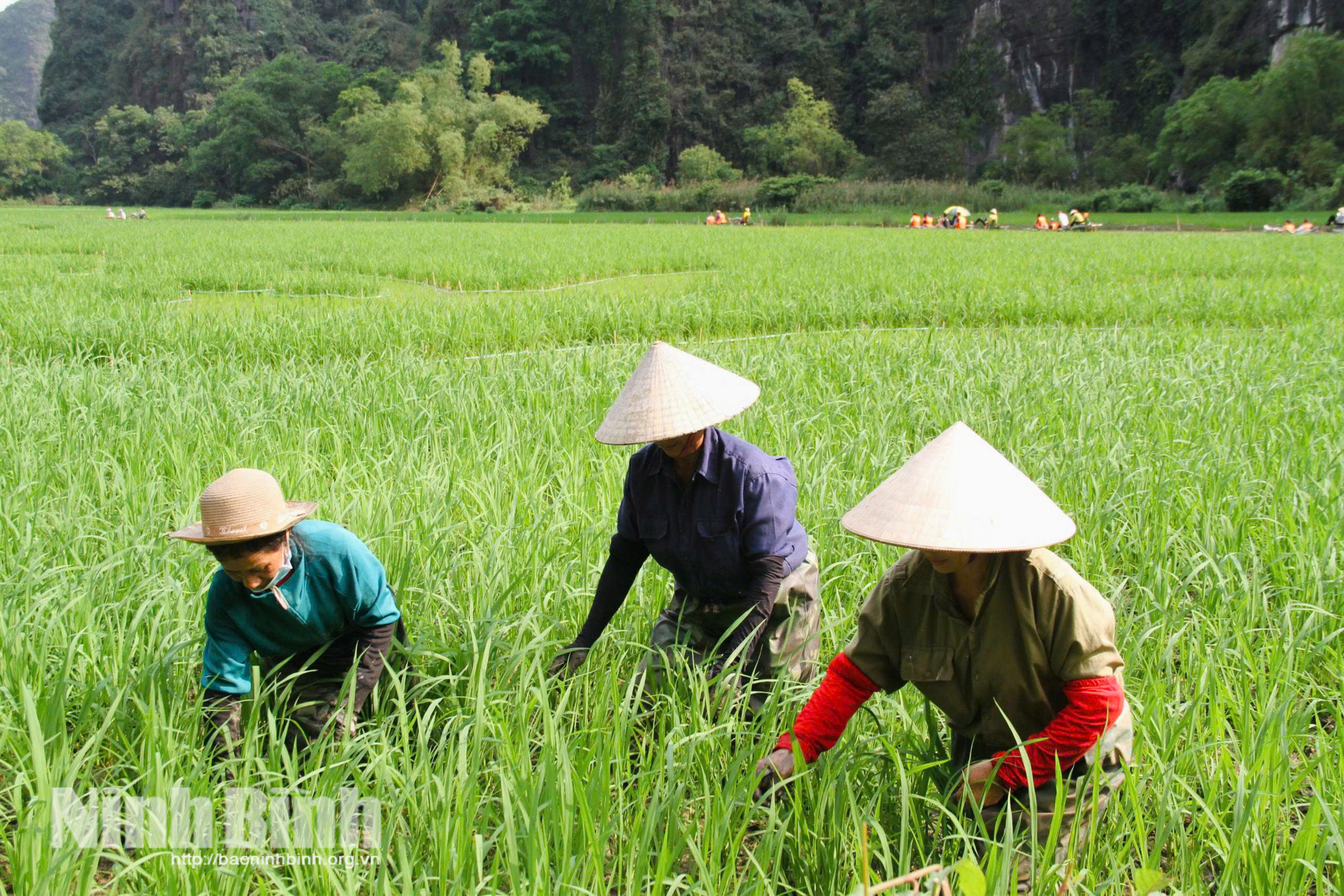 Người dân tích cực chăm sóc cánh đồng lúa.