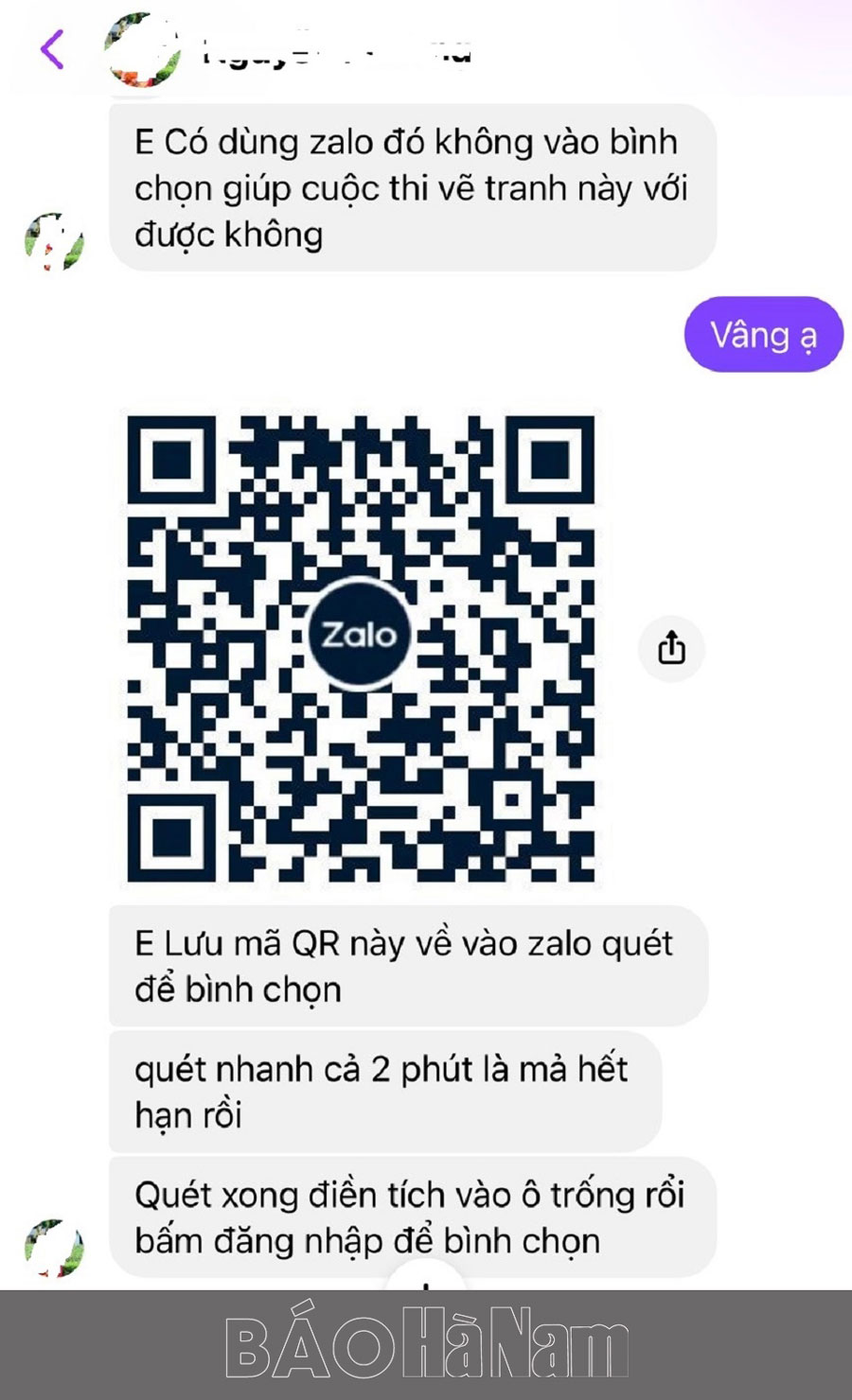 Anh V.H.C trú ở thành phố Phủ Lý (Hà Nam) nhận được tin nhắn messenger của một người bạn khoe việc cháu của người này tham gia một cuộc vẽ tranh và được vào vòng bình chọn trên Zalo; từ đó đề nghị anh C. vào Zalo quét mã QR người bạn gửi kèm để “like” và chia sẻ bình chọn cho cháu. Không chút nghi ngờ, anh C. làm theo rồi đi ngủ.