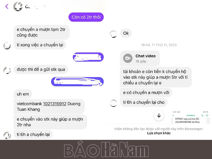 Còn anh T.V.D trú ở thành phố Phủ Lý (Hà Nam) nhận cuộc gọi Video từ messenger của người bạn được khoảng 15 giây và tắt đi, sau đó lấy lý do lỗi mạng rồi nhắn tin hỏi vay mượn số tiền 05 triệu đồng. Tuy nhiên, qua nói chuyện, biết anh D. không còn đủ tiền nên đã vay 02 triệu đồng. Sau khi chuyển tiền xong, anh D. nhận được điện thoại của người bạn thông báo về việc bị “hack” Facebook. Lúc này anh D. mới biết Facebook của bạn anh đã bị các đối tượng “hack” để lừa đảo chiếm đoạt tài sản.
