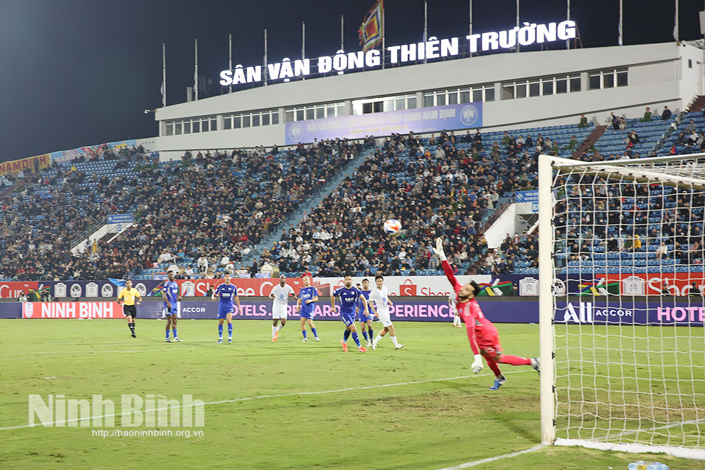 Tiếp tục dồn ép đối thủ, các cầu thủ đội khách đã phải trả giá khi ở phút 90+3, các cầu thủ Thép Xanh Nam Định đã có pha phản công mẫu mực và Xuân Son có cơ hội đối mặt với thủ môn đội khách dễ dàng đưa bóng vào lưới, hoàn thành cú đúp cho riêng mình, đồng thời ấn định chiến thắng 3-0 cho đội bóng chủ sân Thiên Trường.