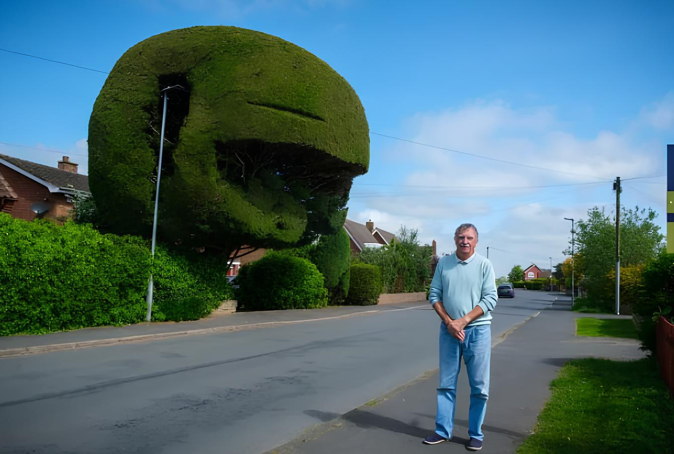 Nhìn từ xa, cây tuyết tùng này như một chiếc mũ bảo hiểm khổng lồ. Tán cây vươn ra khỏi mặt đường, khiến nhiều phương tiện đi qua gặp khó khăn. Ông Peter Davis đã dành khoảng 500 bảng Anh (hơn 16 triệu đồng) mỗi năm để cắt tỉa cây.