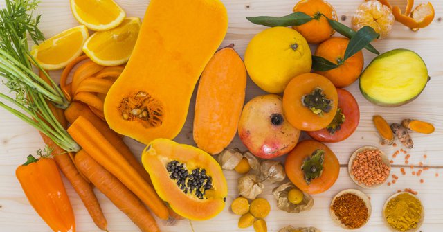 Thực phẩm màu cam và màu vàng tốt cho sức khỏe bao gồm siêu thực phẩm giàu vitamin A (bí đỏ, bí mùa đông, khoai lang và cà rốt), ngô ngọt, bí vàng mùa hè, ớt vàng và cam, đậu lăng màu cam, trái cây họ cam quýt (chanh, cam, bưởi và bưởi) dứa , khế, đu đủ, dưa đỏ, đào và mơ…
